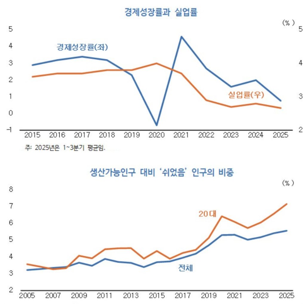 한국개발연구원(KDI) 역시 「최근 낮은 실업률의 원인과 시사점」(2025년 11월)에서 유사한 분석을 제시한다. 2021년 이후 경제성장률이 둔화했음에도 불구하고 2% 대의 낮은 실업률을 유지하는 상황을 고용 여건이 개선된 것으로 보기 어렵다는 것이다. 이 보고서는 2015년 이후 실업률이 3.6%에서 2.7%로 약 0.9%p 하락한 핵심적 요인은 20대 청년층의 ‘쉬었음’ 인구 증가라는 점에 주목한다.