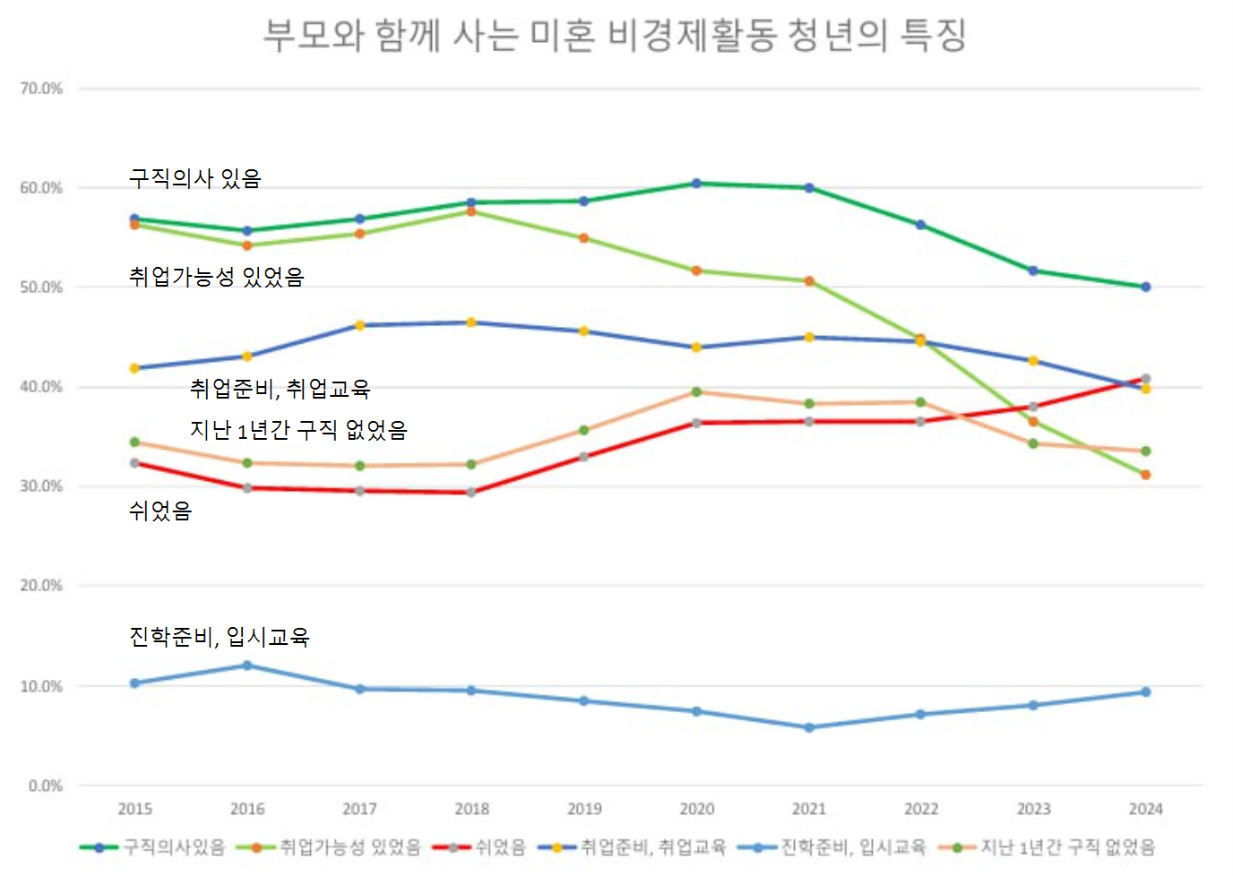 ‘구직의사 있음’ 비율은 2016년 약 55%대에서 시작하여 2024년에 이르기까지 50%로 전반적으로 점차 감소하는 양상을 보였다. 이는 이 집단 내에서도 경제활동을 시작하고자 하는 적극적 의지가 다소 약화되고 있음을 시사한다. 이를 더 극적으로 보여주는 것은 일자리가 주어졌을 때 취업이 가능하다고 응답한 비중이 동일 기간 54%에서 31%로 떨어진 점이다. (자료출처: 이정민, 「비구직 청년의 특성과 정책과제」, 한국노동연구원, 2025년 7월.)