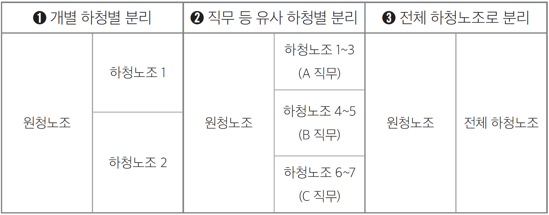 또한, 노동부는 원청과 하청은 원칙적으로 교섭 단위를 분리하고, 이후 하청노조와 원청노조가 공동교섭에 합의하지 못하면 창구 단일화 절차를 진행하되 노동위원회가 이러한 기준을 적용해 교섭 단위를 분리할 수 있다고 설명했다. 또 복수의 하청노조가 공동교섭에 합의하지 못한다면 하청노조들 사이에서 다시 1) 개별하청별 분리, 2) 직무 등 유사 하청별 분리, 3) 전체 하청 통합 노조로 분리 등 여러 유형으로 교섭 단위를 분리할 수 있다.