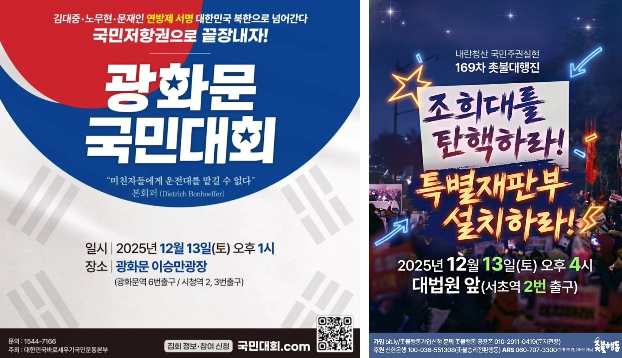 연말에도 규모는 줄었지만 올해 초와 같은 ‘극단의 광장’이 열려있다. 2025년 12월 13일 집회를 알리는 대한민국바로세우기국민운동본부(대국본)와 촛불승리전환행동(촛불행동) 포스터다. 대국본 집회 참가자들은 이날 집회에서 “이재명을 끌어내자”, “(내란 특검을 이끄는)민중기를 끌어내자”, “윤어게인”을 외쳤다. 대국본을 주도하는 전광훈 사랑제일교회 목사는 “이제 국민저항권을 발동할 시간”이라고 발언했다. 김은진 촛불행동 공동대표는 같은 날 집회에서 “내란 수괴(윤 전 대통령)가 아직도 처벌받지 않은 이유는 판사들도 내란범들과 한통속이기 때문”이라고 주장했다. 촛불행동 집회 참가자들은 대법원 앞에서 “조희대(대법원장)를 탄핵하라!”, “(내란)특별재판부 설치하라!”, “국민이 법이다!”라는 구호를 외쳤다.