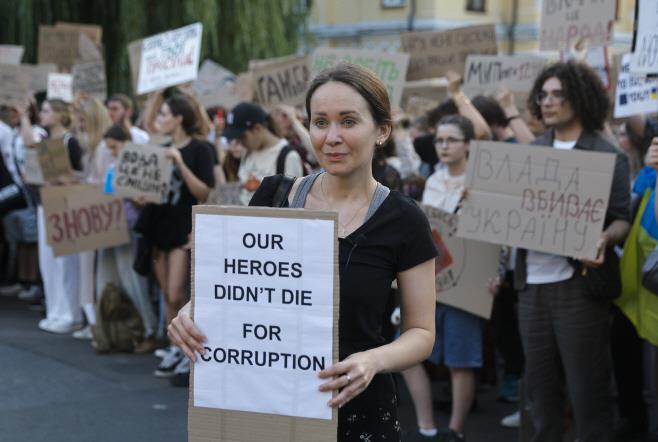 2025년 7월 22일 우크라이나 부패 감찰기관의 권한을 축소하는 법령 통과에 반대하는 시위가 수도 키이우에서 일어났다. 다음날인 23일엔 키이우뿐만 아니라 주요 도시에서 광범위한 대규모 시위가 벌어졌다. 남편이 전장에 있다고 밝힌 한 시민은 《뉴욕타임스》와의 인터뷰에서 “부패를 위해 군인들이 전장에 있는 것이 아니다”라며 “우크라이나 시민사회가 10년간 쌓아올린 노력이 파괴될 수 있다”라고 우려했다. 대규모 시위는 7월 31일 부패 감찰기관 권한강화법이 통과되면서 일단락되었다. (사진출처: 《AP》)