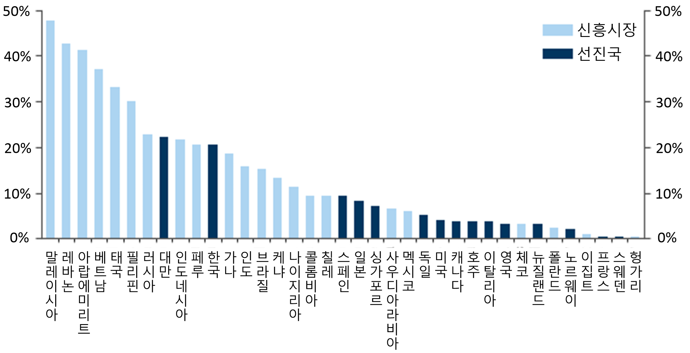 [그림] 각국의 국내생산 중 중국산 수입 증가에 노출된 부분의 비율(%) (자료출처: 국제금융센터)