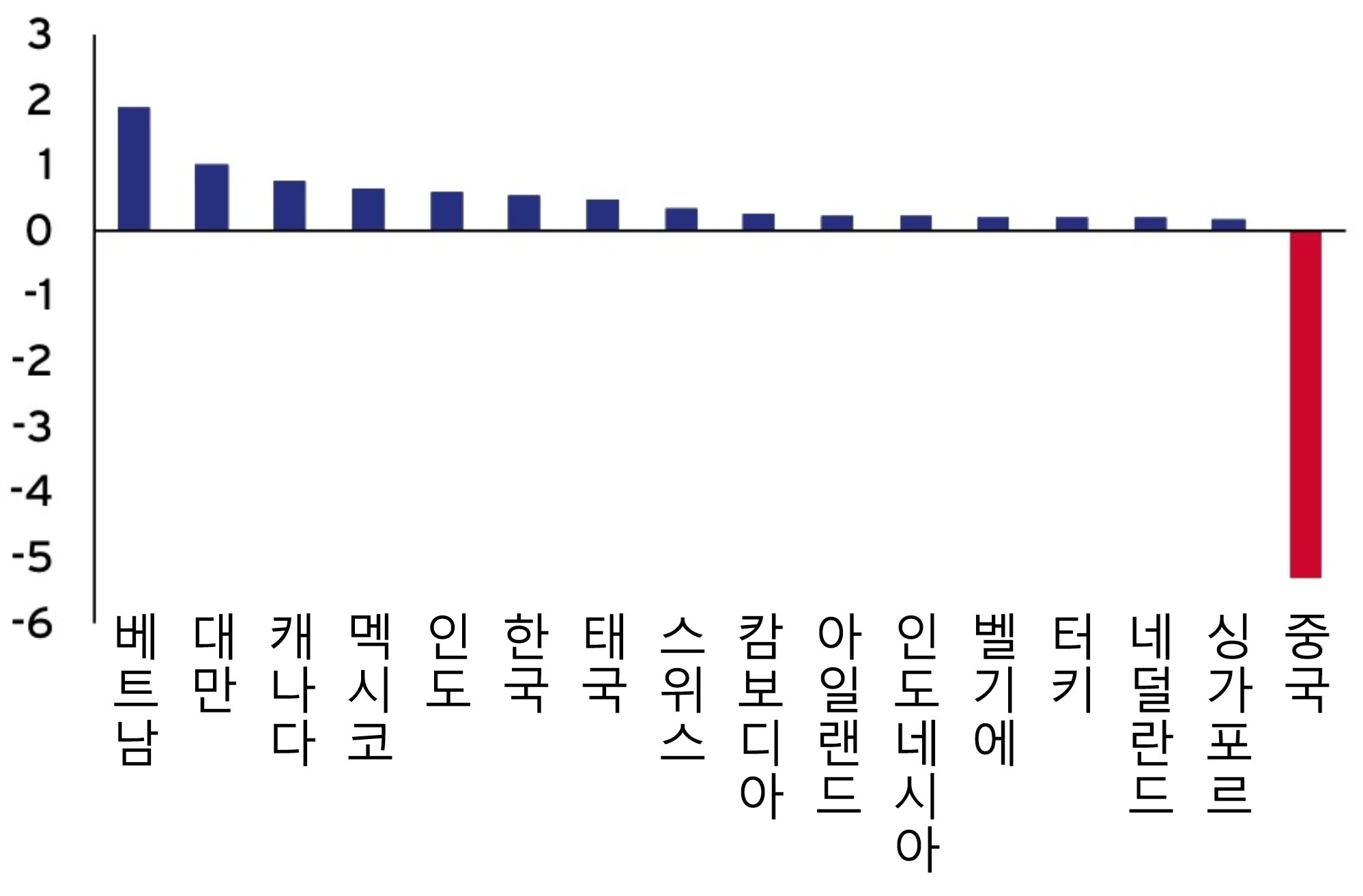 [그림] 2017~2022년 사이 미국의 수출에서 각국이 점한 비중의 변화 (%p)
