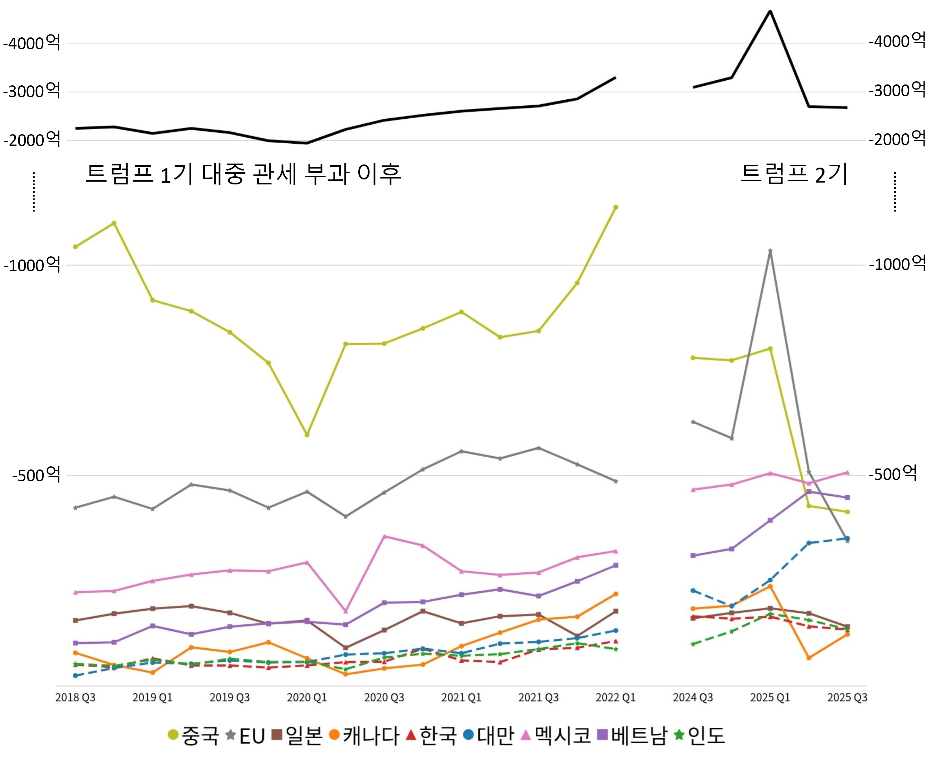 [그림] 트럼프 관세 부과 후 미국의 상품(서비스 제외) 무역적자 (달러, 분기 단위)