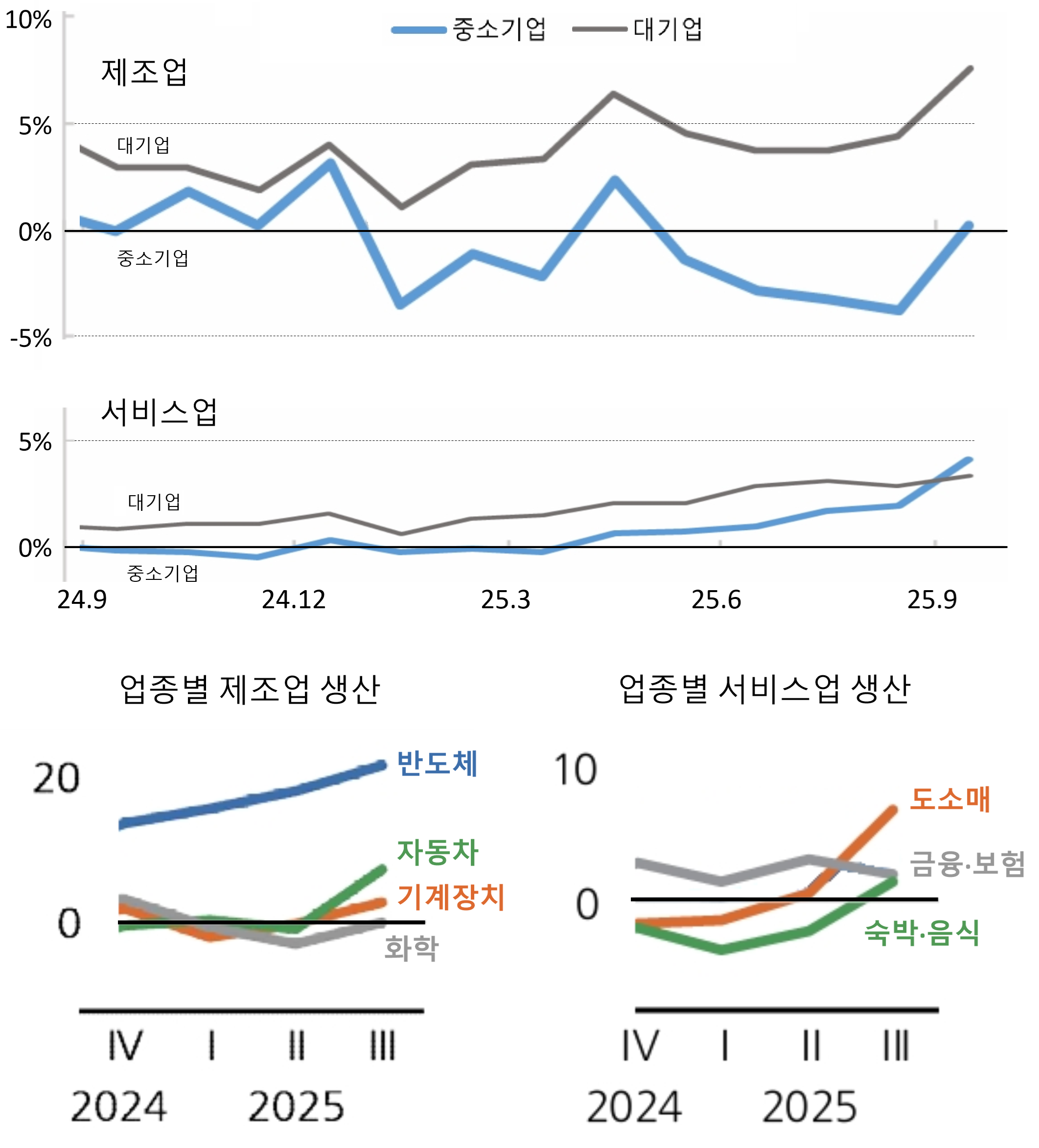 제조업에서 대기업과 중소기업 간 성장률 격차가 확대되고 있다. 2025년 3분기 제조업의 생산 확대는 반도체 수출 호황에 의한 것으로 분석된다. 한편, 서비스업에서는 25년 3분기 중소기업의 생산이 확대되고 있는데, 이를 이끄는 업종은 도소매 및 숙박·음식업으로, 이재명 정부의 소비쿠폰 발행의 영향으로 분석된다. (자료출처: 중소벤처기업연구원, KDI)