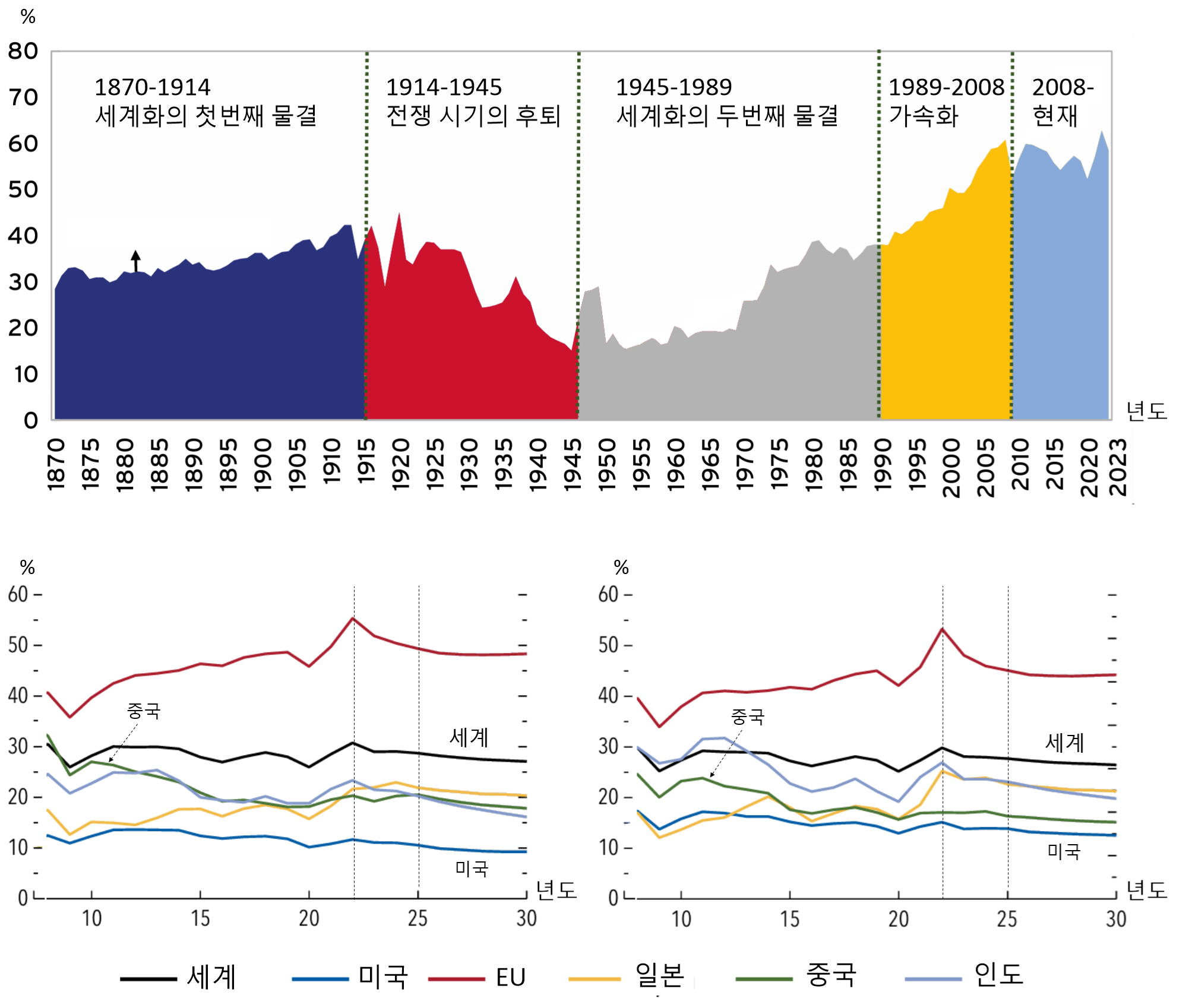장기적 관점에서 보면, 무역 세계화의 지표가 1915년까지의 상승, 1915~1945년의 하락, 1945~2010년의 재상승이라는 세 국면을 거친 뒤, 2010~2022년의 정체 국면을 지나 2022년 이후 본격적인 하락, 즉 ‘탈세계화’ 국면에 진입하고 있는 것으로 해석할 수 있다.