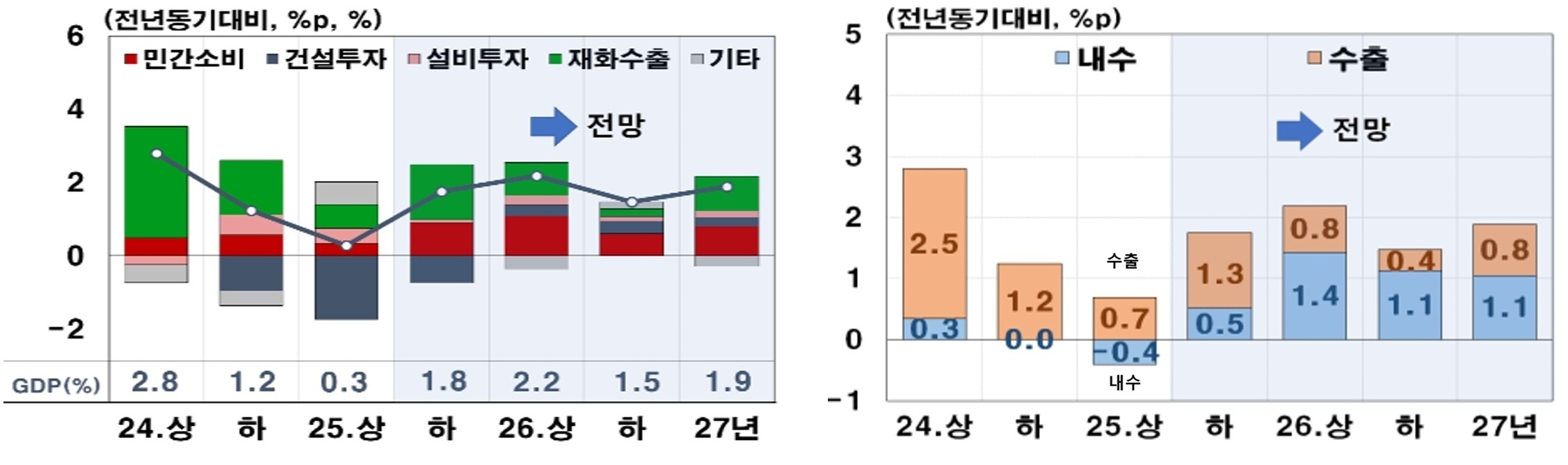 대다수 기관은 한국의 경제성장률이 2024년 2.0%에서 올해 0.9%로 급락한 뒤, 2026년에는 잠재성장률과 같은 1.8%로 반등할 것으로 전망했다. 올해 3분기 반도체 수출 호조로 성장률이 예상보다 개선되면서, 11월에 한국은행은 올해 성장률 전망치를 1.0%로 0.1%p 상향 조정하기도 했다.