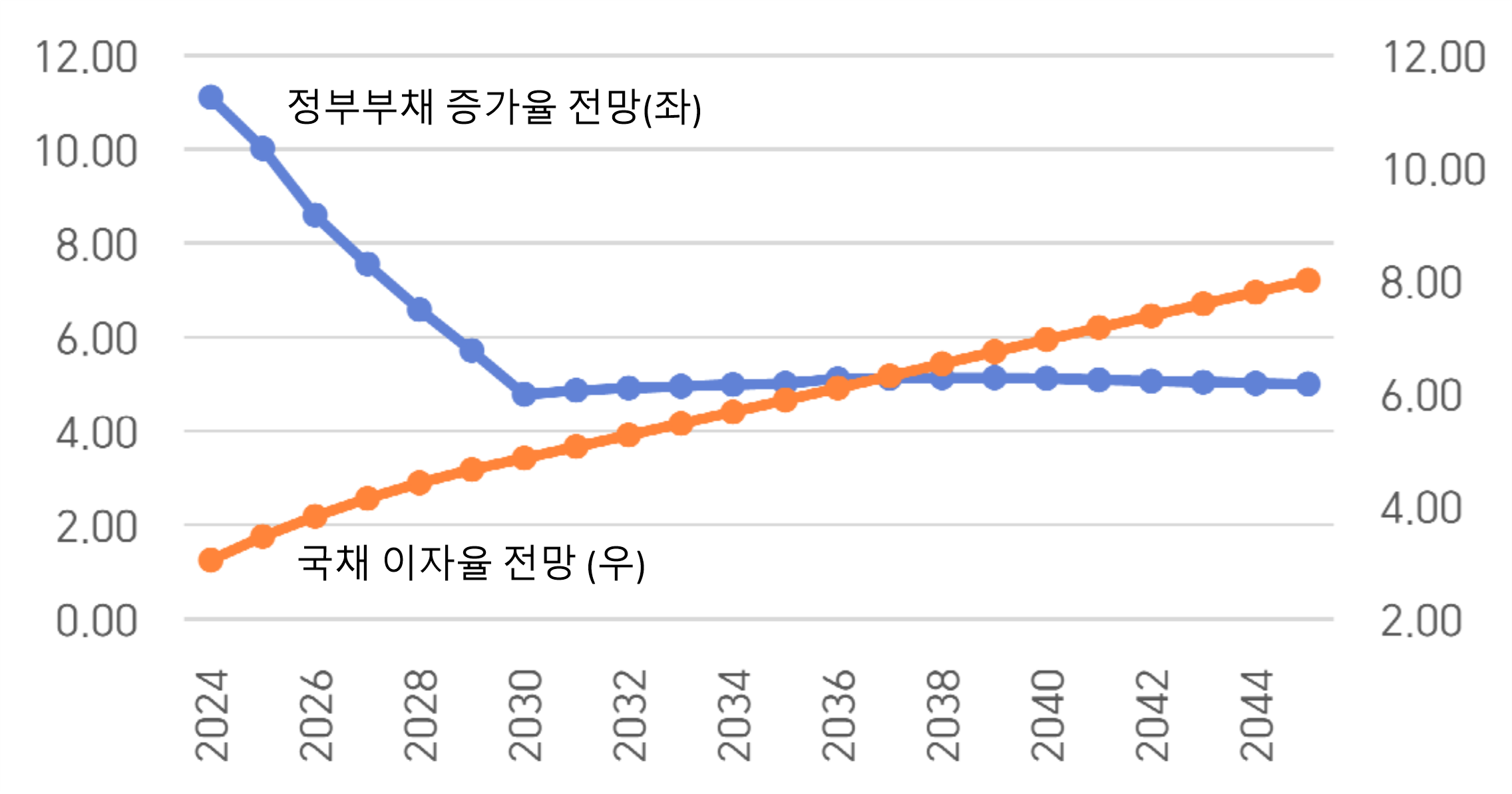 [그림] 정부부채 증가율 및 국채 이자율에 대한 장기 전망치 (%)