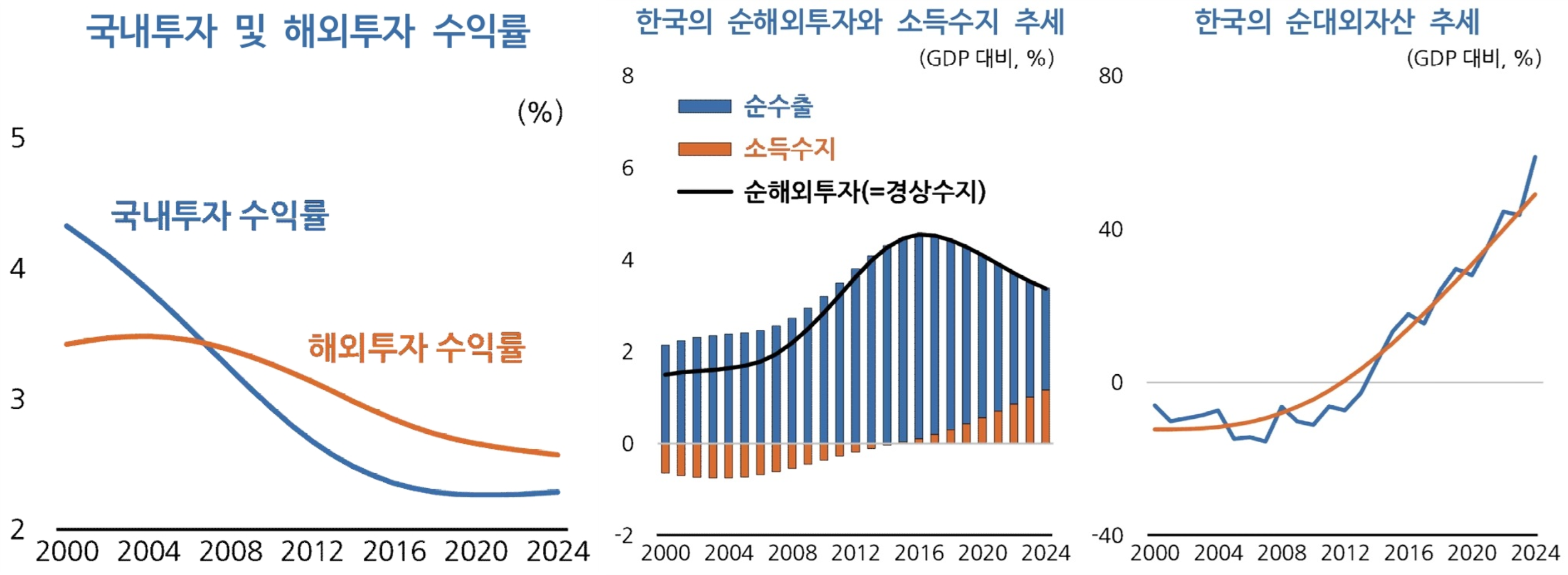 최근 1470원을 돌파한 원/달러 환율의 상승은 단기적 불안이나 외국인 자본 이탈만으로 설명되기 어렵다. KDI에 따르면, 환율 상승의 구조적 배경에는 앞서 3장에서 살펴봤듯 한국경제의 자본수익성 하락과 이에 따른 자본흐름의 근본적 전환이 자리하고 있다. 2000년대 후반을 기점으로 국내 투자수익률이 점진적으로 하락한 반면, 해외 투자수익률은 상대적으로 높게 유지되었고, 2010년대 중반에 이르러 국내·해외 투자수익률이 역전되었다. 이로 인해 한국의 순해외투자는 빠르게 증가했고, 결국 소득수지가 구조적으로 흑자(+)로 전환되는 단계에 이르렀다.