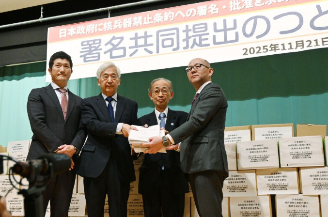 2025년 11월 21일 도쿄에서, (왼쪽 두 번째부터 순서대로) 원수금의 타니 마사시 사무국장, 원수협의 야스이 마사카즈, 사무국장, 피단협의 하마스미 지로 사무국장이 일본 정부의 핵무기금지조약 비준을 요구하는 서명 344만 9012필을 외무성 담당자에게 전달했다. 주최자 인사에서 다나카 테루미 피단협 대표위원은 비핵3원칙의 재검토를 언급하는 다카이치 정권에 대해 “핵무기라는 악마의 도구로 나라를 지키겠다는 것인가”라며 강하게 비판했다. [사진출처: 《지지통신사》]