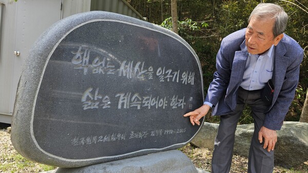 2017년 한국 최초의 원폭자료관으로 세워진 합천원폭기념관 마당의 ‘김형률 기념비’와 심진태 합천원폭자료관 관장. 비석에 “핵 없는 세상을 일구기 위해 삶은 계속되어야 한다”라고 쓰여 있다. 김형률은 생전에 일기에 “합천에 원폭기념관이 생겼으면 좋겠다”고 썼다. [사진출처: 《경남도민일보》]