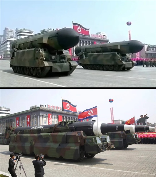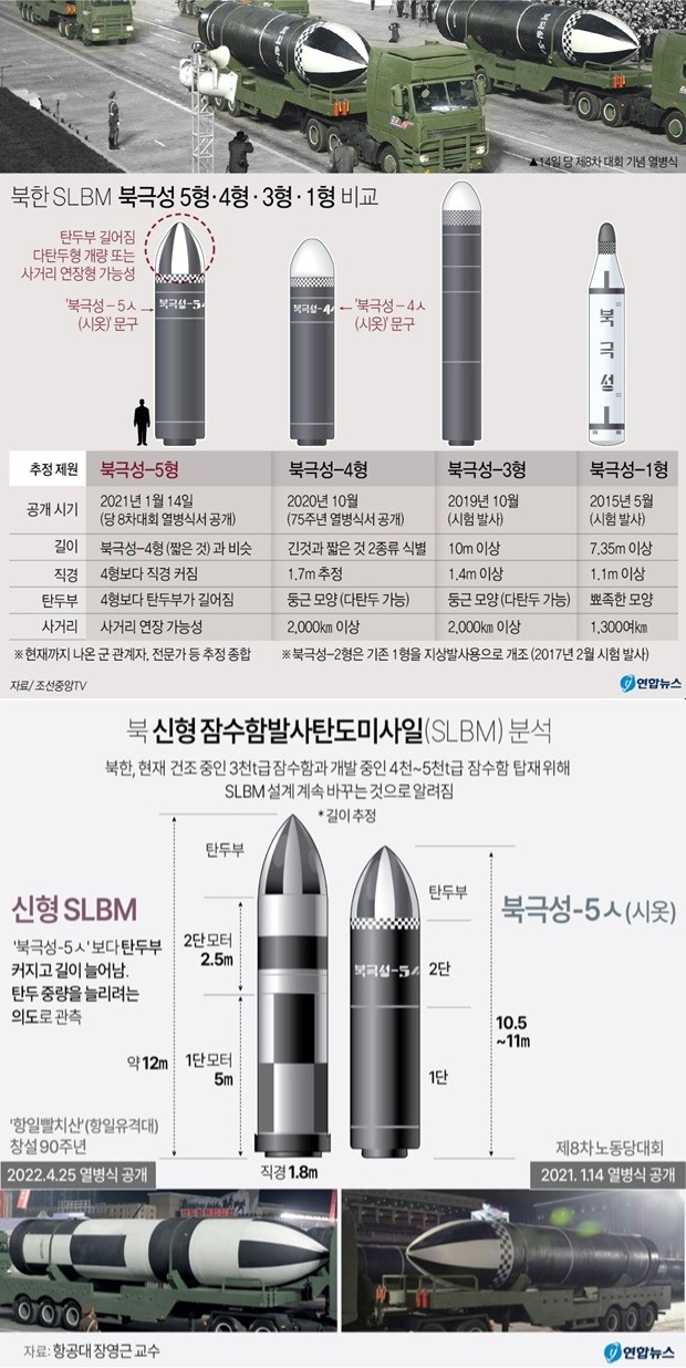 북한 신형 SLBM (북극성-6 추정)과 북극성-5 비교 (아래) (출처: 연합뉴스)