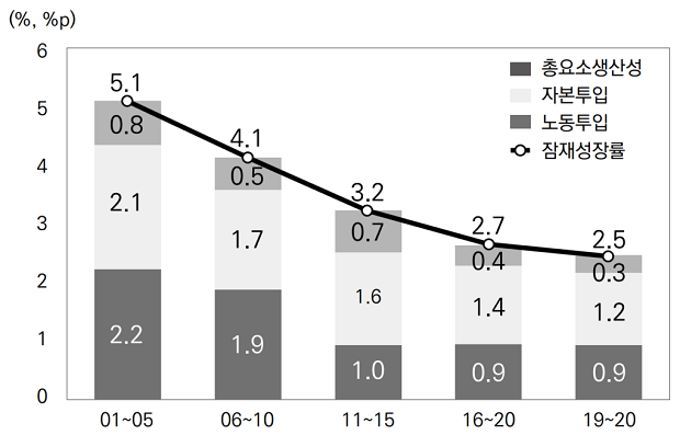 그런데 잠재성장률 상승 요소를 노동시간, 자본투입, 총요소생산성 세 가지로 나눠보면 자본투입의 역할이 매우 컸다고 분석한다. 비농업 부문만 고려했을 때 2008~2018년 중 실질 잠재성장률은 1.8%인데, 이 중 노동시간 기여분이 0.3%, 자본투입 기여분이 0.8%, 총요소생산성 기여분이 0.7%다. 2002~2007년 중 잠재성장률은 2.8%인데, 이 중 노동시간 기여분이 0.2%, 자본투입 기여분이 0.9%, 총요소생산성 기여분이 1.6%다. 기술혁신을 반영하는 총요소생산성 기여분이 크게 낮아진 것을 확인할 수 있다. 지난 10년은 1950년 이후로 총요소생산성이 가장 낮은 기간이었다.