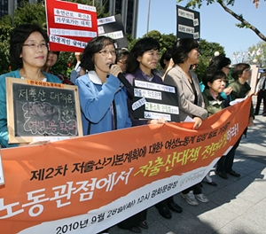 여성의 현실과 권리를 외면한 ‘여성 활용’ 정책 정부는 지난 9월 14일 저출산 고령사회 기본계획(이하 기본계획)을 발표하는 공청회를 개최했다. 2006년부터 추진하던 1차 기본계획의 기조를 유지하되 한계지점을 보완하는 방향이다. 10월 26일 국무회의를 거쳐 기본계획은 최종 확정되었고 이후 입법절차를 밟아 실행될 예정이다. 그러나 기본계획이 출산과 양육에 유리한 환경을 조성할 것이라는 정부의 주장과 달리 대다수 여성․노동 단체들은 정책이 실효성이 없거나 오히려 여성들의 어려움을 가중시킬 것이라고 평가하고 있다. 저출산의 원인은 정부도 지적하고 있듯이 노동시장에서 여성들의 취약한 지위와 여성에게 집중되어 있는 양육의 부담이다. 1997년 경제위기 이후 여성 노동자의 비정규직 비율이 70%에 육박했고 성별임금 격차는 지속적으로 확대되는 상황에서 여성들은 노동시장에서의 퇴출이자 양육의 전담을 의미하는 출산과 경제활동 사이에서 선택을 강요받고 있다. 이 같은 상황을 타개하기 위해서는 여성의 고용안정과 임금격차 축소, 돌봄노동의 사회적 책임 강화에 중점을 두고 정책이 추진되어야 함에도 불구하고 정부는 정반대 방향으로 나가고 있다. 일-가정 양립이라는 명분하에 여성들의 일자리를 불안정하게 만드는 유연근무제의 도입이나 민간 보육시설 활성화 방안 등에서 정부 정책의 의도가 확인된다. 경제성장을 위해 여성이 출산해야할 의무가 있다는 이데올로기를 강화하고 신자유주의가 야기한 재생산의 위기를 여성에게 전가하며 여성노동력을 값싸게 활용하여 바닥을 향한 경쟁을 가속화시킬 구상이다. 저출산 대책은 정부의 이러한 구상의 일부를 수행하기 위해 추진되고 있다. 기본계획은 저출산 문제를 해결하기 위해 일-가정 양립의 일상화, 결혼출산․양육부담 경감, 아동․청소년의 건전한 성장환경 조성이라는 기본방향으로 추진된다. 저출산 대책의 핵심적인 몇 가지 쟁점을 중심으로 문제점을 비판하고 정부의 의도를 분석해보자. [%=사진1%] 실효성 없는 육아휴직급여 정부는 일-가정 양립을 위해 첫째로 육아 휴직 급여 정률제 도입 및 복귀 인센티브 도입을 제시한다. 현재 육아휴직 급여는 정액제로 월 50만 원을 지급하고 있는데, 정률제를 도입해 통상임금의 40%를 육아휴직 급여로 지급하여(상한 100만 원 하한 50만 원) 육아휴직 기회를 확대하겠다는 방침이다. 그러나 그 실효성이 의심스럽다. 정책은 지금과 같은 수준의 육아휴직 급여로는 양육과 생계가 불가능기 때문에 육아휴직 이용률이 10% 미만에 그치고 있다는 사실을 간과하고 있다. 정률제가 도입된다 하더라도 현실적인 필요수준에 턱없이 미달해 육아휴직이 확대되지 않을 것이다. 뿐만 아니라 지원이 더 절실한 저임금 노동자들의 생활을 보전하는 방식이 아니라 소득에 따른 차등지급 방식은 계층별 격차를 낳는다. 그리고 육아휴직을 쓸 수 있는 대상들은 그나마 고용이 안정된 여성이다. 대다수의 비정규직 노동자들은 고용불안으로 육아휴직을 쓸 수 없으며, 고용보험의 사각지대에 있어 육아휴직 급여를 받을 수 없는 실정이다. 정률제가 도입된다 하더라도 여성 노동자들의 고용안정과 고용보험 가입률 증가 등이 뒷받침되지 않는다면 실효성이 없다. 한편 복귀 인센티브 도입 역시 문제가 있다. 경력단절을 방지하기 위해 육아휴직 급여의 15%를 복귀 후에 주겠다는 것인데 정부가 여성의 경력단절 원인을 한참 잘못짚고 있음을 반증한다. 경력단절은 기업에서 출산한 여성의 복귀를 원치 않거나 자녀 양육을 여성이 전담해야 하는 현실에서 비롯된 것이지 여성의 의욕이 부족해서 발생한 것이 아니기 때문이다. 노동유연화 확대하는 유연근무제 일-가정 양립을 위한 정책으로 두 번째는 유연근무제와 육아기 근로시간 계좌제를 들 수 있다. 풀타임 위주의 경직적인 장시간 근로환경이 여성에게 경제활동과 자녀양육 간 선택을 강요하고 있다며 이를 타개하기위한 방안으로 제시한 것이다. 유연근무제는 5개 분야 9개 유형으로 도입되고 있는데 그 중 시간제 근무를 활성화할 방침이다. 이를 위해 전일제 1인 담당 업무를 시간제 2인이 담당하는 직무공유제를 추진하는데, 단시간 비정규직 일자리를 창출하여 상시적인 고용규모 변동을 용이하게 한다. 뿐만 아니라 시간제 업무가 가능한 업무는 주로 여성들이 담당하던 업무일 가능성이 크며 비핵심 업무로 분류되어 고용과 임금 인사제도의 차별로 이어질 것이다. 이 같은 유연근무제는 여성노동자의 고용불안과 비정규직화를 확대하는 것뿐만 아니라 노동강도 역시 강화한다. 노동부 고용지원센터의 직업상담원 상용직 단시간 채용 사례를 보면 확인할 수 있다. 기존 정규직 2명이 하는 일을 5시간 근무하는 단시간 근로자 3인이 나눠 한다. 1일 16시간의 일을 1일 15시간(3*5)에 하는 것이다. 또한 육아기 근로시간 계좌제는 연장․야간․휴일근로에 대해 임금지급 대신, 육아기에 사용하도록 하자는 것으로 노동자에게 지급되어야 할 임금을 빼앗는 정책에 다름 아니다. 결국 정부가 내세우는 일․가정 양립이란 노동시간을 탄력적으로 사용할 