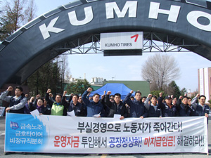 투기꾼에게 손실을, 노동자에게 고용안정을! 3월 3일 금호타이어 자본이 끝내 3월 3일 1,199명에 대한 구조조정 계획을 지방노동청에 제출했다. 193명을 정리해고하고, 1,006명을 하도급 업체로 내보낸다는 것이 주요 내용이다. 금속노조 금호타이어 지회는 정리해고 대신 큰 폭의 임금 삭감을 허용하는 타협안을 사측에 제시했지만, 사측은 이를 일언지하에 거부하고 정리해고를 밀어붙이고 있다. 사실 자본 입장에서 노조의 양보안은 그리 입맛에 맞는 것이 아니었다. 사측의 계산은 간단하다. 2009년에 비해 영업이익을 2,000억 원 정도 증가시키기 위해 비용과 매출의 숫자를 맞추는 것이다. 사측 계산은 전체 생산직의 25% 규모에 달하는 인력 조정과 40% 가까운 임금 삭감을 통해 연간 1.000억~1,500억 원 정도의 노동 비용을 절감하고, 경기 회복으로 매출을 20~30% 증가시키면 올해는 작년보다 2,000억 원 정도 추가 이익을 낼 수 있다는 것이다. 2009년 약 2,000억 원 규모의 영업손실을 기록했기 때문에, 이 계획대로라면 2010년에는 작은 수준에서나마 영업이익을 낼 수 있다. 금호타이어 자본이 3월부터 기를 쓰고 구조조정을 감행하려고 하는 데는 숨겨진 이유가 있다. 현재 금호타이어 박삼구 회장의 주식은 전량이 담보로 잡혀 있는 상태라 사실상 주채권 은행인 산업은행이 박삼구 회장의 인사권자다. 박삼구 회장은 산업은행과 다른 채권자들에게 기업 수익을 증가시켜 채무를 상환하겠다는 강한 의지를 보내주어야만 경영권을 유지할 수 있다. 이것이 강도 높은 구조조정의 숨은 이유다. 이번 구조조정 계획이 채권단에게 보내는 첫 번째 신호인 셈이다. 궁지에 몰린 것은 노동조합 아니라 채권단과 박삼구 회장 현재 금속노조 금호타이어지회는 8~9일 쟁의행위 찬반투표를 거쳐 3월 중하순부터 파업 투쟁에 돌입한다는 계획이다. 하지만 집행부는 지난 양보안에서 볼 수 있듯이 파업 투쟁 의지보다는 양보를 통한 적당한 타협에 무게를 두는 듯 보인다. 그러나 박삼구 회장은 노동자들과 타협을 고려하고 있지 않다. 지금 그의 머릿속에는 채권단이 위임한 경영권을 유지하고, 더 나아가 다시 그룹의 소유권을 되찾아오기 위한 술책만이 존재할 뿐이다. 금호타이어 노동자에게 필요한 것은 강한 단결과 단호한 파업이다. 채권 금융기관과 채무 기업 사이의 채무 조정 과정인 워크아웃 과정에서 금융 기관들은 노조에 구조조정 합의서를 요구하고 있다. 현재 급한 쪽은 빚을 받아야 하는 금융 기관들과 경영권 확보를 위해 금융 기관들의 비위를 맞춰야 하는 박삼구 회장이다. 최악의 상황으로 금호타이어가 부도 후 법정관리로 가더라도 노동자 입장에서는 더 잃을 것이 없다. 법정관리인이 회생계획을 낸다고 해도 전체 노동자의 4분지 1을 해고하고, 임금을 40% 가까이 삭감하는 구조조정안보다 더 나쁜 안을 제출하기는 쉽지 않다. 구조조정이 진행되지 않아 채권단이 부도 처리 수순을 밟는다면 결국 현재보다 나빠지는 것은 경영권을 잃는 박삼구 회장이다. 이미 대부분 공장이 가동률 90% 이상을 회복한 상황이고, 6.2지방선거를 앞두고 광주 전남 지역 고용 문제를 함부로 다룰 수 없다는 정치적 조건도 노동조합에 유리하다. 노동자를 희생시켜 금호를 되찾겠다는 박씨 일가의 술책 금호타이어 노동자 생존권 문제와 더불어 이번 투쟁은 금속노조가 향후 산별노조로서 투쟁해야 하는 방향을 제시할 수 있다는 점에서도 중요하다. 금호타이어 부실은 투기적 금융 자본과 재벌 소유주가 어떻게 기업과 나라 경제를 망칠 수 있는가를 보여주는 대표적 사례기 때문이다. 금속노조가 산업정책을 이야기하려면 21세기 한국 자본주의의 두 축인 재벌과 초국적 금융자본을 우회할 수 없다. 금호타이어 부실은 매출감소에 따른 영업손실로 터져 나왔지만, 부실의 근본 원인은 2006년 금호그룹이 대우건설을 인수하면서부터 시작되었다. 금호그룹은 약 6조 원에 가까운 대우건설을 인수하기 위해 그룹 계열사의 자금을 총동원했다. 금호산업이 1조 7천억 원, 금호타이어가 4천 5백억 원, 아시아나항공이 2천 6백억 원 등을 투자하여 금호그룹 내에서 3조 원 정도를 마련했다. 나머지 3조 원은 재무적 투자자라고 불리는 국내외 사모펀드들이 자금을 동원했다. 금호그룹은 인수대금의 50% 정도만을 마련하고 나머지는 빚으로 채운 것이다. 무리한 기업 인수는 몇 가지 점에서 문제를 발생시켰다. 먼저 금호산업, 금호타이어 등은 무리한 자금 동원으로 부채 규모가 2005년에 비해 급증하며, 매년 이자 부담과 자금 상환 압박을 받게 되었다. 금호타이어의 이자비용은 2005년 400억 원 규모였는데, 2008년 1,540억 원으로 급증했다. 2008년 영업이익이 362억 원인 것을 참작하면, 당해 타이어를 생산해 번 돈보다 4배나 되는 돈을 금융기관에 이자로 지불한 것이다. 금호타이어의 부채비율도 급증하여 2008년 233%였던 부채비율이 2009년 1,085%가 되었다. 이러한 재무구조 악화가 기업 경영 전체에 영향을 미쳤다. 2006년 이후 국내 생산 공장에 대한 설비 투자가 급감하여, 2005년 약 8천 2백억 원 규모였던 설비자산은 2008년 6천 7백억 원 규모로 20% 가까이 줄어들었다.