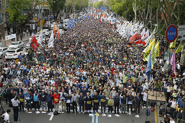 달라진 것은 사회운동의 상황이다. 노무현 정권 시기에는 최소한 반신자유주의전선이라는 문제의식이 존재했고, 한미FTA 반대 투쟁, 이라크 파병 반대 투쟁과 평택 미군기지 확장 저지 투쟁, 노동법 개악과 노조탄압에 맞서는 대중적인 연대투쟁이 실질적 의미를 가지고 전개되었다. 내부의 이견이 있을지언정 민중연대라는 반신자유주의 연대체가 존재했고, 범국민행동 참가 여부를 쟁점으로 논쟁이 가능했다. 그러나 이명박·박근혜 정권 10년을 거치는 동안 반신자유주의 연합은 민주주의 연합으로 대체되었고, 소위 “민주대연합전선”은 신자유주의 세력과의 연합을 정당화하는 알리바이가 되었다. 민주노총은 문재인 정권 출범 초기부터 소득주도성장 전략을 추종하고 경사노위 참여를 적극적으로 추진하면서 정권의 하위 파트너를 자임했다. 심지어 탄력근로제부터 파업권을 제한하는 노조법 개악까지 민주노총이 결사반대하는 사안들이 정권 주도로 경사노위에서 논의되는 상황에서도 민주노총 집행부는 경사노위 참여를 밀어붙였다. 이명박·박근혜 정권이었다면 상상도 못 할 이러한 상황은 문재인 정부와의 협력을 통해 보수 세력에 맞선다는 기본 정세인식이 민주노총 집행부에 뿌리 깊게 자리 잡고 있다는 것을 보여준다. 요컨대 시민운동 진영과 통일운동진영이 주도하는 반이명박·반박근혜 투쟁 10년을 거치면서 반신자유주의라는 문제의식은 사실상 소멸했고, 민주/반민주라는 구도 아래 민주당의 정치적 입장과 사실상 수렴하는 방향으로 반보수전선의 성격이 퇴행한 것이다.