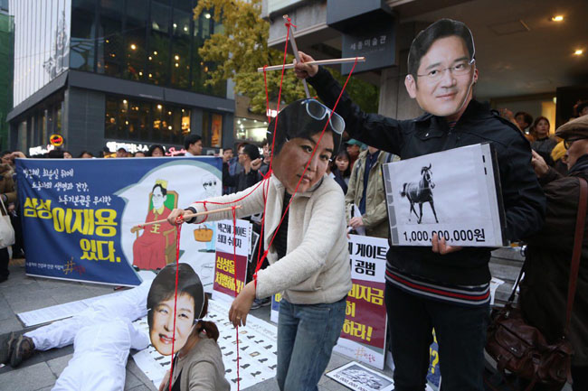 삼성 이재용의 3대세습을 위해 6천억원 이상의 손실을 끼치면서까지 국민연금을 농단했다. 현대차 정몽구의 유성기업 노조파괴범죄와 불법파견범죄를 처벌하지 않았다. SK 최태원 회장과 CJ 이재현은 특별사면되었다. 박근혜정권은 의료와 철도 등을 민영화하는 서비스산업발전기본법을 만들었다. 롯데 신동빈은 박근혜에게 준 뇌물의 대가로 면세점 특혜와 대형 유통망을 독점했다. 그 결과 중소상인들의 생존권이 박탈당했다. 뇌물수수 공범인 박근혜와 재벌총수들은 구속처벌되어야 한다.