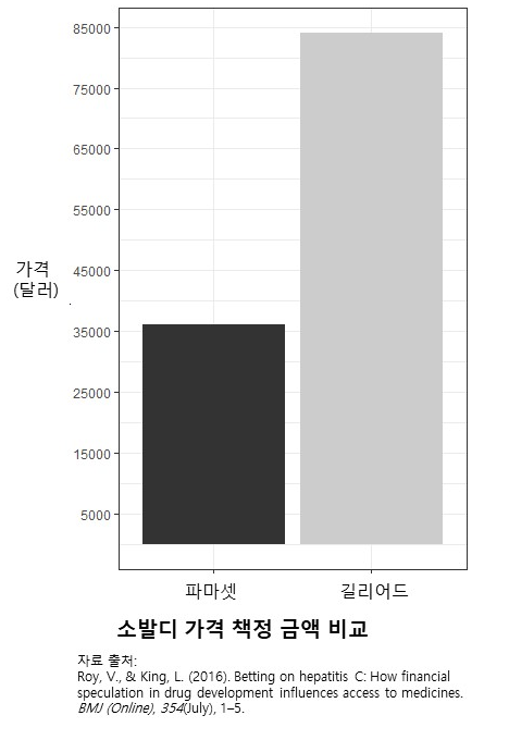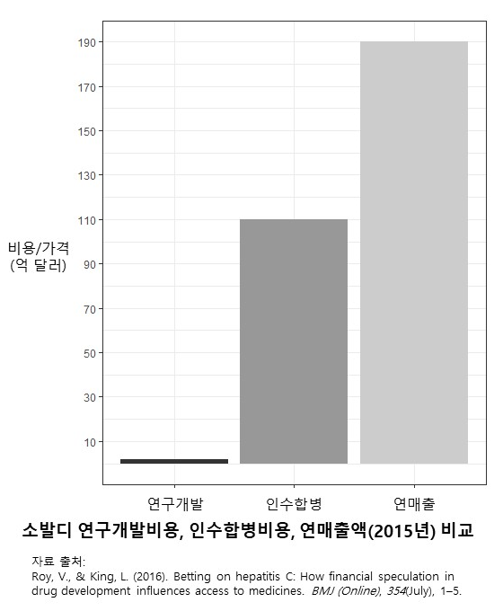 가격 인상의 가장 큰 요인은 인수합병 비용이었다. 길리어드는 110억 달러(13조 5000억 원)를 들여 파마셋을 인수합병 한다. 소발디 예상 개발비용의 58.5배였다. 파마셋은 소발디 이외에는 유망한 신약이 없었기 때문에 길리어드의 인수합병은 오로지 소발디를 위한 것이었다. 소발디를 직접 출시할 수도 있었던 파마셋은 길리어드사가 제시한 엄청난 금액에 끌려 회사를 넘기는 선택을 했다. 길리어드는 파마셋보다 훨씬 큰 초국적 대기업이었기 때문에 약품의 보험 가격 책정과 유통 및 처방에 영향력을 행사할 수 있는 시장 지배력을 가졌다. 그 결과 인수합병 비용까지 고려해도 많은 이윤을 남길 수 있는 8만 4천 달러라는 가격에 소발디를 출시한다. 약값을 높이는 인수합병, 왜 하는 것일까: 연구개발 비용을 정부 세금으로 전가