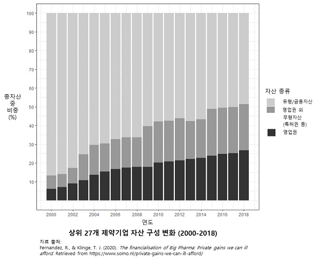 그런데 영업권 같은 무형자산은 주기적으로 가치를 평가하는 과정을 거친다. 따라서 실제로 시너지 효과를 보여주지 않으면 영업권 규모가 줄고 손실이 발생한다. 이런 일이 발생하지 않도록, 인수합병 후 제약회사는 시너지 효과를 내려고 적극적으로 노력한다. 일종의 ‘자기실현적’ 예언이 된다. 이런 노력을 통해 특허권과 영업권이 대부분을 차지하는 제약기업의 무형자산 비중은 빠른 속도로 증가했다. 2018년 기준, 상위 27개 제약기업의 총자산 중 무형자산 비중이 50%를 넘고, 무형자산 중 절반이 영업권이다(Fernandez & Klinge, 2020).