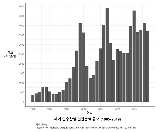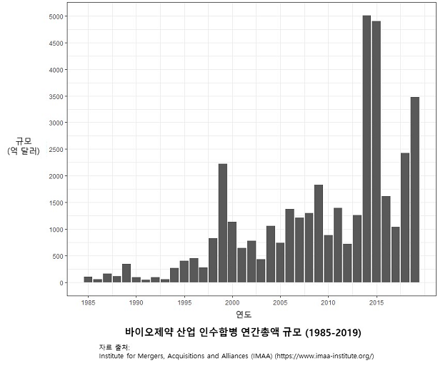 제약회사도 마찬가지다. 1990년대 초반까지만 해도 연간 100억 달러를 넘지 못하던 제약회사 인수합병 규모는 2000년대 들어서 연간 500~1000억 달러 수준으로 증가한다. 생명공학 기업도 마찬가지다. 1990년대엔 연간 10억 달러 수준이었던 인수합병 규모가 연간 50~100억 달러까지 증가한다(Young, 2015).
