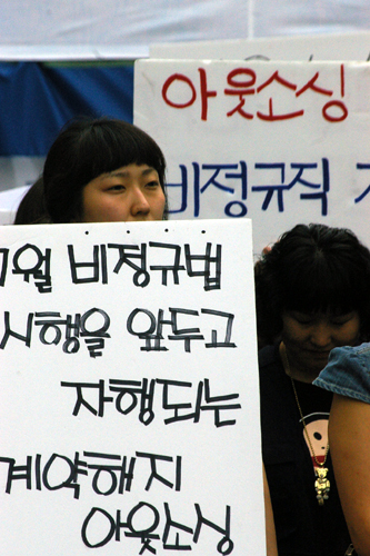 비정규악법에 맞서 승리하기 위하여 [%=사진1%] 비정규직 노동자들의 반격이 시작되다 법안이 상정될 때부터 충분히 예상되었듯 비정규악법 시행을 앞두고 대규모 해고, 계약해지 와 외주용역화 사태가 번지고 있다. 7월부터 시행될 ‘비정규직 보호 법안’이 결코 보호 법안이 아니라 희대의 악법임은 더 이상 말할 필요조차 없다. 이미 현실에서는 전체 규모를 파악조차 하지 못할 정도로 엄청난 수의 노동자들이 임의로 계약해지를 당하고 있는 실정이다. 당장 정권과 자본의 공세에 맞서 투쟁을 전개하는 것이 가장 중요한 과제임을 또다시 강조할 필요는 없을 것이다. 비정규노동자들 스스로가 그 사실을 알고 있으며 전면적인 투쟁을 개시했기 때문이다. 이미 이랜드 일반노조와 뉴코아 노조는 현장 노동자들의 극심한 고용불안, 해고와 외주화에 맞서 투쟁을 전개하고 있고 10일 공동총파업에 돌입한다. 0개월 근로계약서까지 나도는 마당에 유통노동자들이 단결해 투쟁전선을 구축하지 않고서는 결코 인간다운 삶을 보장받을 수 없다는 것을 깨달은 것이다. 또한 특수고용노동자들이 노동3권 보장을 요구하며 총력 투쟁을 준비 중이다. 그리고 공공부문, 각종 민간 서비스부문 노동자들이 비정규악법의 문제가 자신의 문제임을 인식하고 투쟁의 대열에 동참하고 있다. 게다가 건설노동자들도 타워크레인 노동자들이 건설 현장의 70%를 마비시키며 6월 투쟁의 포문을 연 것을 필두로 덤프, 레미콘 노동자들도 파업투쟁을 결의하였다. 사무금융의 코스콤 비정규 노동자들도 불법파견을 철폐하고 직접고용을 요구하며 투쟁하고 있다. 이러한 비정규직 주체들의 투쟁을 중심으로 6월 비정규직 악법에 대한 저항이 커지고 있다. 비정규악법으로 인해 그야말로 벼랑끝으로 몰리고 있는 비정규 노동자들이 스스로 투쟁의 주체로 나서고 전선을 구축하고 있는 것이다. 비정규악법 철폐 투쟁전선을 구축하자 비정규직 문제가 전사회적인 문제가 된 것은 오래지만 지금 당면하고 있는 문제는 비정규 악법으로 인한 비정규직 노동권 말살과 비정규직 양산이다. 2년의 기간 내에서 계약직과 파견직을 무한정 쓸 수 있도록 하는 비정규악법 시행을 앞두고, 사용자는 해고를 자행하고 정부는 현실을 외면하며 이를 부추기고 있다. 지금도 이러한데 7월 이후 이 법이 시행된다면 더욱 광범위한 해고사태가 발생할 것은 불을 보듯 뻔하다. 따라서 노동자운동은 비정규악법 투쟁전선을 구축하는데 주저해서는 안된다. 시행령 개입에만 몰두해 비정규악법 자체를 폐기하는 전선을 제대로 세우지 못한다면 시행령 통과 이후 투쟁을 확대하기 힘들 것이다. 특히 비정규악법이 정규직의 비정규직화를 노리고 있다는 것을 생각하면, 지금부터 이에 대한 대응을 시작해야 하는 것이다. 그러므로 노동자운동은 6월에 비정규직 악법 철폐투쟁을 중심으로 비정규 노동자들을 조직하고 비정규 투쟁을 강화하며 투쟁주체를 확대해야 한다. 비정규악법에 맞서 승리하기 위해 첫째, 우선 비정규 악법의 실체를 끊임없이 알려내고 투쟁을 더욱 확대해야 한다. 정부는 무기근로계약 전환, 비정규직보호대책 등의 기만적인 선전을 통해 정부가 마치 비정규 노동자들을 정규직으로 전환해 주는 양 행세하고 있다. 실제 생활에서 불안정한 노동에 시달리는 비정규직 노동자들은 자신들이 처한 현실이 비정규악법 때문이라는 점을 서서히 알아가고 있지만, 여전히 정부의 각종 대책이 발표될 때마다 그 대책들의 좋은 이름들 때문에 쉽게 현혹되고 있다. 이러한 상황에 맞서 비정규직악법이 실제 노동현장에서 노동의 불안정화를 더욱 심화하고 있음을 폭로해야 한다. 또한 신자유주의 금융세계화를 신봉하고 있는 노무현 정권이 비정규직을 양산하고 노동자 생존권을 말살하고 있다는 것을 알려내고 이러한 상황에 맞서 싸워야 함을 선전해야 한다. 둘째, 대량계약해지, 외주용역화 되고 있는 노동자들을 투쟁의 주체로 세워야 한다. 최대한 지지 지원 투쟁을 전개하는 것과 동시에 투쟁하고 있거나 투쟁을 준비 중인 비정규직 노동자들을 모아내 공동 투쟁으로 투쟁을 집중해야 한다. 뉴코아노조와 이랜드노조 공동투쟁과 같은 연대 투쟁을 활성화시키고 공동의 전선을 구축하며 이를 전체 노동자 투쟁으로 확대시켜야 한다. 여기저기에서 비정규직 노동자 투쟁을 만들어내고 투쟁의 기운을 북돋우고 연대의 분위기를 형성하면 전반적인 노동자 투쟁의 사기를 높일 수 있고, 그러한 활발한 투쟁들을 악법 폐기 투쟁으로 모아낼 수 있을 것이다. 셋째, 산별임단투 투쟁에서 비정규직 노동기본권을 쟁취하고 정규직-비정규직이 실질적인 연대 투쟁을 할 수 있도록 해야 한다. 금속산별을 필두로 하여 산별노조는 비정규 노동자 조직화와 노동권 쟁취를 중심에 놓고 투쟁을 조직하여 비정규 악법 폐기 투쟁전선 구축에 복무할 때 더욱 큰 힘을 발휘할 수 있다. 이를 위해 무엇보다도 현장과 지역의 활동가들이 나서야 할 것이다. 비정규직 문제는 단지 쪽수가 많은 하층 노동자들의 문제만이 아니다. 비정규직 노동자운동의 승패는 현 노동자운동의 혁신