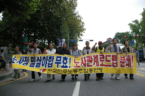2. 이 날 통과된 노동법 개악법안은 지난 11월 30일 통과된 비정규직 개악법안과 한 쌍이다. 비정규직 개악법안은 2년 이내 기간에 계약직이건 파견직이건 무한정 사용할 수 있는 권리를 사용자들에게 부여하고 있어서 비정규직을 더욱 확대 양산하게 만드는 법안이다. 노사관계로드맵 노동법 개악법안은 복수노조 허용을 3년 유예하고 필수공익사업장 범위를 확대하며 파업시 대체인력을 사용가능하게 하였고, 정리해고 사전통보 기간을 줄였다. 결국 사용자 입장에서 보면 신자유주의적 노동의 불안정화를 법 제도적으로 보장받은 것이다. 비정규직 사용을 마음대로 할 수 있고, 노동조합 활동이나 노동자의 저항을 효과적으로 차단하는 수단을 갖추게 된 것이다. 기업활동의 자유만을 일방적으로 보장하고 노동자의 손발을 묶고 권리를 봉쇄하는 이러한 악법에 대해 노무현 정권이나 열린우리당은 “국제적 기준에 맞춰 노동기본권을 보장하고 사용자에 대한 과도한 규제를 해제한 것”이라는 기만적인 발언을 해댔다. 올해만 해도, 하중근 열사를 죽게 만들고 수많은 비정규 노동자들의 저항을 공권력으로 무자비하게 탄압하고 구속 노동자를 양산한 반노동자 정권, 사기정당은 반드시 심판받아야 할 것이다.