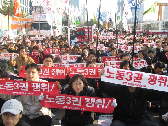 공무원노조 총파업의 의의와 이후 투쟁 전망 서 형 택 |전국공무원노동조합 정책기획실장 공무원노조는 11월 15일부터 3일간 역사적인 총파업을 단행하였다. 그 결과 대부분의 기관에서 파업 참가자에 대한 탄압으로, 가장 손쉬운 공직배제 징계(파면, 해임)가 이루어지고 있다. 이런 상황에서 늘 그렇듯이 왜 그들이 파업투쟁을 벌이게 되었는지는 뒷전이고 법을 지켜야하고 모범을 보여야 할 공무원들이 법령을 위반하고 집단행동을 벌인 것은 잘못이라는 시각들이 대부분이다. 한데 이쯤 해서 국가는 도대체 왜 존재하는지 한번 고민해 볼 필요가 있다. 사회구성원의 다양한 목소리를 듣고 정책에 입안하고 사회적 평등이 이루어지도록 공공의 선이 달성되도록 노력해야 하는 것이 국가의 책무가 아닌가? 그런데 국가가 나서서 일방의 주장을 무시하고 자신의 지배논리만을 내세워 여론을 조작하고 왜곡된 여론을 확대 재생산하는 구조를 통해 국민의 자유의지를 말살하려고 하고 있는 것이 현 정부의 모습이다. 공무원노조가 앞장서서 공직사회 개혁 부정부패 척결을 아래로부터 해 나가겠다는 내부 자정의지가 무엇이 그리 잘못이라는 말인가? 부패구조를 끊어 놓겠다는 우리의 의지가 기득권의 밥줄을 끊는 일이 되는 것이라는 사실을 이번 총파업을 통해 여실히 확인했다. 지연, 학연, 선거연, 매관매직 등으로 얼룩진 공직사회를 상식이 통하는 능력사회로 바꾸어 누구나 자신의 노력에 대해 행복한 결과를 누리는 사회를 공직사회부터 만들어 일반사회에 전파하여 국민 모두가 행복한 삶을 살도록 하겠다는데 수구세력들은 한사코 만류하고 있다. 공무원노조가 총파업을 단행하게 된 사유는 미국의 일방적인 신자유주의 정책이 도입되어 시행된 지 십 수 년이 지난 지금 국가 운영의 대부분에서 폐해가 두드러지게 나타나고 있는 현실을 우리는 목도하고 있기 때문이다. 신자유주의 정책은 공무원을 대상으로 우선 시행하고, 확대하여 일반화해 가는 특성을 갖고 있다. 이번에 정부에서 제정하려고 하는 공무원노동조합법에 관해서도 성격규명을 해 보면, 우선 위헌적인 법률이라는 것이다. 헌법 제33조의 규정에 의해 공무원노동자에게 당연히 보장되어야 할 기본적 권리를 부정하고 있다. 당연히 최소한의 제한이라는 헌법상의 규정도 무시한 것은 짐작할 만하다. 두 번째로 반 인권적인 법률이다. 공무원도 노동자로서 노동기본권을 보장하여야 하고 그 노동기본권은 공무원노동자에게 있어 인권에 해당하므로 이를 부정하는 것은 반 인권적인 구시대적 발상이다. 세 번째로 반민주적 법률이다. 사회구성원에게 필요한 법령을 제정하면서 당사자에게는 한마디 상의도 없이 일방적으로 밀어 붙이기 식으로 추진하는 것은 비민주적이며 민주를 가장한 또 다른 국가 폭력이며 독재 잔재의 반영이다. 네 번째로 반역사적 법률이다. 정부는 1953년에 제정된 법령과 전교조 법령보다 후퇴하는 법령을 입법하려고 하는 작태를 보이고 있다. 마치 공무원에게 보다 나은 권리를 보장하면 세상이 뒤집어질 것처럼 호들갑을 떠는 꼴이 안타깝기만 하다. 공무원노조는 정부의 이런 기만적이고 후안무치하고 양상군자 같은 행태를 바로잡기 위해 총파업에 나섰다. 총파업의 성과는 여러 측면에서 분석되고 조직적으로 평가되어야 한다. 아직 조직 내에서 전체가 공감하는 평가는 없지만 개인적인 관점에서 바라보는 성과를 몇 가지 열거하면 다음과 같다. 첫째 노무현 정권의 일방주의에 대해 정권 내부에서 저항이 있음을 알리는 직접적 타격투쟁이었다. 두 번째로 공무원노조 총파업은 남한 사회의 전민중진영의 지지와 엄호 속에 강력한 연대투쟁의 힘을 보여주었다. 세 번째로 공무원이 노동자인가 라는 정체성의 인정여부를 뛰어 넘어 노동기본권의 구체적 인정 범위까지를 사회적으로 쟁점화 시켜낸 대중 투쟁이었다. 네 번째로 공무원노조가 초기 직장협의회라는 협의체에서 벗어나 당당히 노동조합으로서 조직사업의 경로와 모범을 확인한 조직 강화 발전을 위한 많은 과제를 풍성히 안긴 소중한 투쟁이었다. 마지막으로 철밥통이라는 이기적인 면을 부각시킨 정부를 향해 파면과 해임이라는 희생을 통해 공무원노동자들이 집단이기주의의 발로가 아닌 국가사회 발전을 위한 미래지향적인 목표의 순수성을 확인시켜 주었으며 탄핵정권, 부패정권과 비교하여 도덕적 우위를 지키는 고귀한 투쟁이었다. 이러한 공무원노조 투쟁의 정당성을 훼손하기 위해 정권은 안간힘을 다 쓰고 있다. 3,500명 전원을 기필코 파면 처분할 것이고 복직은 꿈도 꾸지 마라는 둥 헛소리를 해대고 있다. 그리고 파업에 동참하는 조합원이 적어 희생자만 낳는 무모한 투쟁이었다느니 하는 선전을 하고 있다. 미안하지만 노무현 정권과 그 똘마니들이 있는 정권에서는 복직을 시켜줘도 복직하지 않고 연장 투쟁을 전개할 것이니 걱정 마시오. 그리고 77개 지부에 45,000명이 참가한 총파업 투쟁을 간사한 잔꾀로 무력화시키기 위해 당신들이 저지른 수작들을 기억하라. 총파업에 참가한 일선 지부장의 노모를 협박, 함께 사는 후배를 겁박하