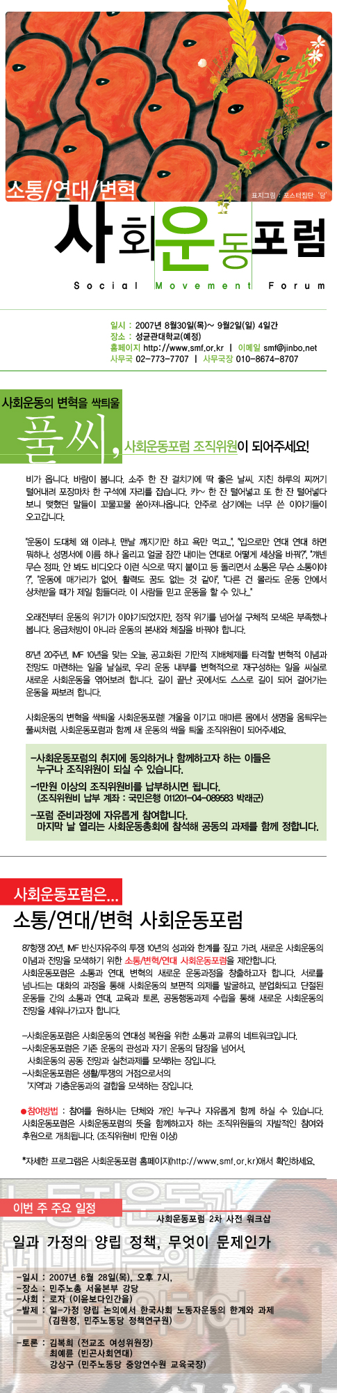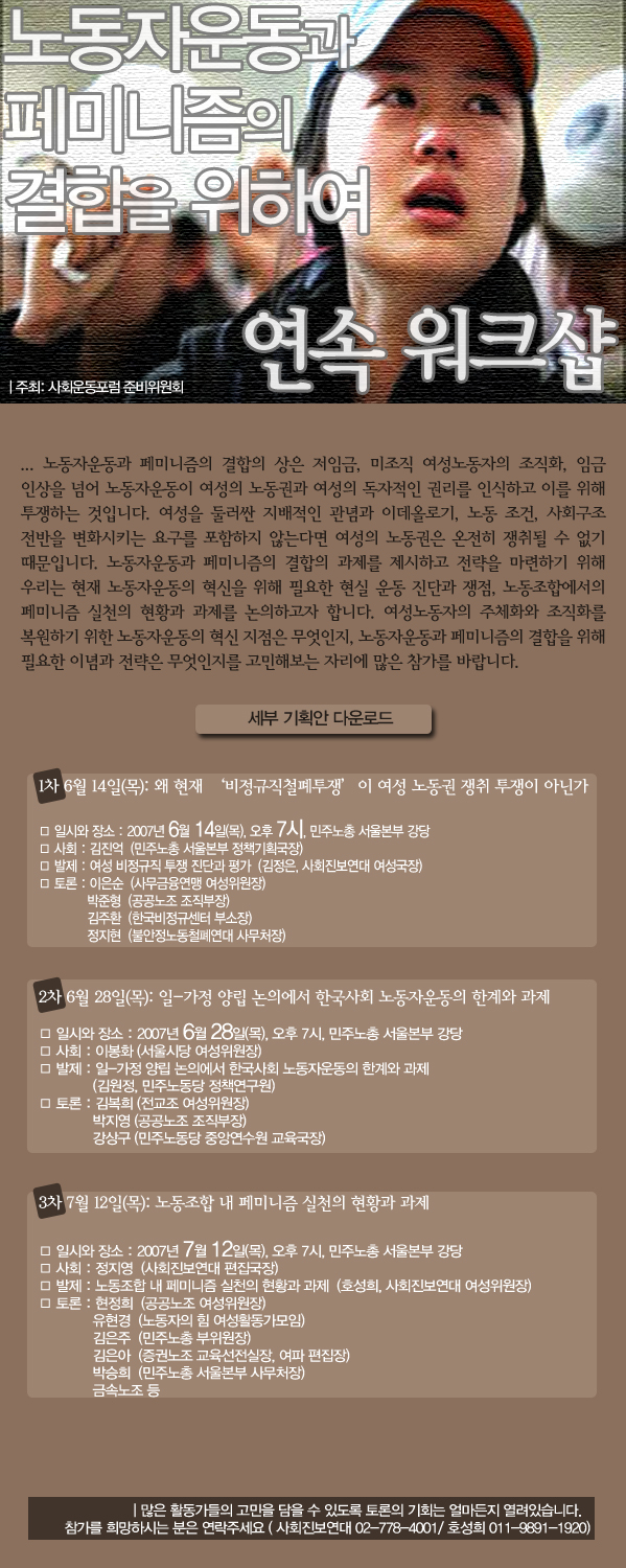여성운동과 노동자운동의 마주침의 공간에서 여성노동권 쟁취투쟁은 가능하다 1987년은 노동운동사와 여성운동사에서 이정표가 되는 해이다. 1987년 7·8·9월 노동자 대투쟁이 그러하고 1987년 <한국여성단체연합>(이하 <여연>) 및 <한국여성노동자회>(이하 <한여노>)의 결성이 그러하다. 1987년 3월 창립된 <한여노>는 '한국 노동운동사에서 최초의 독자적인 여성노동자들의 조직건설이라는 역사적 출발'이라고 평가된다.1) <여연>은 '진보적 여성단체들의 상설적인 여성운동 공동 투쟁체'라는 성격을 표방하며 결성되어 한국여성운동을 대표하는 조직으로 자리 매김한다.2) 그러나 아이러니하게 이 시기를 전후로 하여 집단적이고 조직적인 여성노동자운동은 소멸되었으며 노동의 불안정화 현상은 여성노동자들을 대상으로 광범위하게 확산되었다. 이러한 문제에 대해 당시 노동자 운동과 여성 운동 모두 적절한 대응을 하지 못하였을 뿐 아니라 양자가 서로를 자신의 무능에 대한 알리바이로 삼았다. 이러한 경향은 1997년 IMF 외환위기를 거치며 극대화되었으며, 또한 2007년 현재 비정규직 여성노동자 투쟁을 둘러싼 대응에 있어서도 반복되고 있다. 1. 87년 전후로 시작된 노동의 불안정화, 그리고 남성생계부양자 모델의 확립 1980년대 중후반 이후 여성 생산직 노동자의 비율은 크게 감소한 반면 여성 시간제 노동자의 비율은 눈에 띄게 증가하였다.3) 이는 신자유주의 금융세계화의 흐름과 더불어 남한사회 산업 구조가 변화하게 됨에 따라 나타난 현상으로, 노동의 불안정화가 여성노동자들을 우선으로 하여 본격화되었음을 의미한다. 그러나 당시 이러한 문제는 노동자 운동의 중심 투쟁과제로 부각되지 못하였다. 이는 1987년 7·8·9월 대투쟁 이후 활성화된 노동자 운동이 임금인상 및 기업복지를 투쟁의 중심 요구로 해왔던 흐름과 관련이 있으며, 노동자 가족의 중산층 이데올로기 수용과정과 무관하지 않다. 1987년을 전후로 하여 노동자 운동은 중공업 대공장 남성노동자들의 조직된 힘, 즉 사업장 교섭력을 바탕으로 가족임금과 기업복지를 요구하기 시작하였다. 이러한 요구는 당시의 노동자 운동의 전투성을 통해 쟁취되기도 하였지만, 남한사회 가족정책의 일환과 맞아떨어지는 것이기도 하였다. 남한사회에서는 1961년부터 시행된 가족계획 사업으로 소가족화 현상이 나타났다. 이와 더불어 산업구조의 변화와 도시화 등과 같은 사회경제적 변화, 생존에 필요한 지식과 경제적 자원을 독점했던 가부장권의 약화라는 이데올로기적 조건의 변화에 의해 남한 사회의 핵가족화가 진행된다.4) 가족임금은 이러한 핵가족 모델의 물질적 조건이 된다. 그런데 이는 양성간의 임금격차를 정당화하고 여성의 노동을 일시적이고 주변적인 것으로 간주하게 만든다.5) 뿐만 아니라 여성에게 무급의 가사노동을 강제함으로써 여성의 이중부담을 강화한다. 생산의 영역에서 남성 노동력에 대한 초과착취가 가능하기 위해서는 재생산 영역에서 여성 노동력에 대한 초과착취가 전제되어야 하기 때문이다. 이처럼 가족임금은 남성 가장의 노동을 통해 나머지 가족이 부양될 수 있다는 환상의 물적 조건이 되지만, 이는 사실 허구적인 것에 불과한 것이다. 그러나 노동자 운동은 가족임금을 오히려 노동자민중이 투쟁을 통해 쟁취해야 할 중심요구로 삼았고, 이에 따라 남성 생계부양자와 여성 가사전담자라는 도식은 강화된다.6) 이러한 상황에서 1980년대 후반 여성노동자들이 겪어야 했던 노동의 불안정화 현상이 가시화되지 못한 것은 필연적인 결과라고 할 수 있다. 1970년대 농촌 여성들을 대거 생산직 공장노동으로 흡수함으로써 한강의 기적이라는 산업화의 토대를 마련한 남한사회가 1980년대에 이르러서는 고부가가치 산업 중심으로 재편되면서 유연한 노동력으로써 여성을 활용해 감에 따라 여성노동의 불안정화 현상이 확대되었으나, 생산영역에서 여성의 노동은 결혼 이전의 일시적인 것이거나 혹은 아이들의 교육비 부담 등과 같은 보조적인 것으로 여겨지는 현실에서 이러한 현상은 노동자 운동의 해결과제로 인식되기 어려웠던 것이다. 여성운동 진영 역시 이러한 한계에서 자유롭지는 못했다. 물론 당시 여성노동자들이 급속하게 노동의 불안정화 현상을 겪게 된 현실에 대한 문제의식은 있었으나, 이러한 현상의 원인에 대한 정확한 분석은 부재한 채 경공업이나 여성 중심의 노동운동에 대한 관심이 약화되어서는 안 된다는 점만 강조할 뿐이었다. 그리고 오히려 1987년 이후 가시화된 '가족투쟁'을 여성운동사에 있어서의 '새로운 영역의 개척'으로 평가한다.7) "이전의 노동자투쟁에서 가족들이 했던 역할은 파업투쟁 현장에서 남편이나 자식들을 끄집어내는 것이었습니다. 그러나 1987년 7·8·9 대투쟁에서 가족들은 변화하였습니다. 처음에 가족들은 남편이 집에 안 들어오니까 궁금해서 농성장을 방문하였는데 그때 비로소 남편이 일하는 작업 환경을 보게 되었지요. 이전에는 허리띠를 졸라가며 살아도 못사는 이유가 남편의 무능력 때문이라고 여겼는데, 진정한 이유는 그것이 아니라는 것을 깨닫게 되었지요. 남편