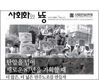 더 많은, 더 넓은 민주노조를 만들자 11월 10일 전국 노동자대회에서 배포된 유인물입니다. 첨부파일을 다운받으세요. [사회화와 노동 특별호 9호] 1면 - 탄압을 넘어 새로운 87년을 기획할때 : 더 많은, 더 넓은 민주노조를 만들자 - 노동자가 '민주주의의 기본원칙'을 다시 세우자 2면 - 지금 전교조 투쟁에 필요한 것은 - 시간제 일자리 확산에 맞서 싸우자 - 휴일근로 연장근로 포함을 빌미로 근기법 개악? 3면 - 비정규직 투쟁에 연대하자 (인천공항 비정규직 파업투쟁, 학교비정규직 파업투쟁) - 원격의료가 아니라 공공의료를 강화하라 - 맞춤형 억제전략, 한반도 평화를 보장할까? 4면 - 삼성전자의 추악한 진실 : 노동자 착취, 소비자 우롱, 재벌만 살찌우다 - 2013년의 전태일 - 삼성공화국을 바꾸기 위해 힘을 집중해야 한다