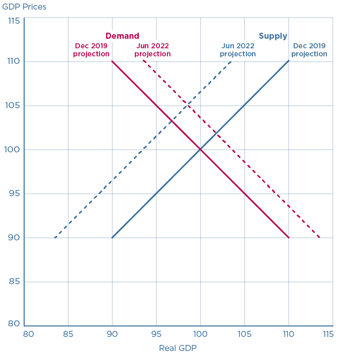 샌프란시스코 연준은행의 아담 샤피로는 「공급과 수요는 얼마나 많이 인플레이션을 추동하는가」(2022년 6월 21일)라는 글에서 수요 요인과 공급 요인을 분리하여 계량하는 간단한 아이디어를 제시했다. 간단한 수요공급 곡선을 떠올려보면, 수요가 증대하면 거래되는 수량과 가격이 모두 상승하고, 수요가 감소하면 가격과 수량이 모두 감소한다. 즉 수량과 가격이 같은 방향으로 움직인다. 반면 공급이 증대하면 수량은 증가하나 가격이 하락하고, 공급이 감소하면 가격은 상승하나 수량이 감소한다. 즉 수량과 가격이 반대로 움직인다.