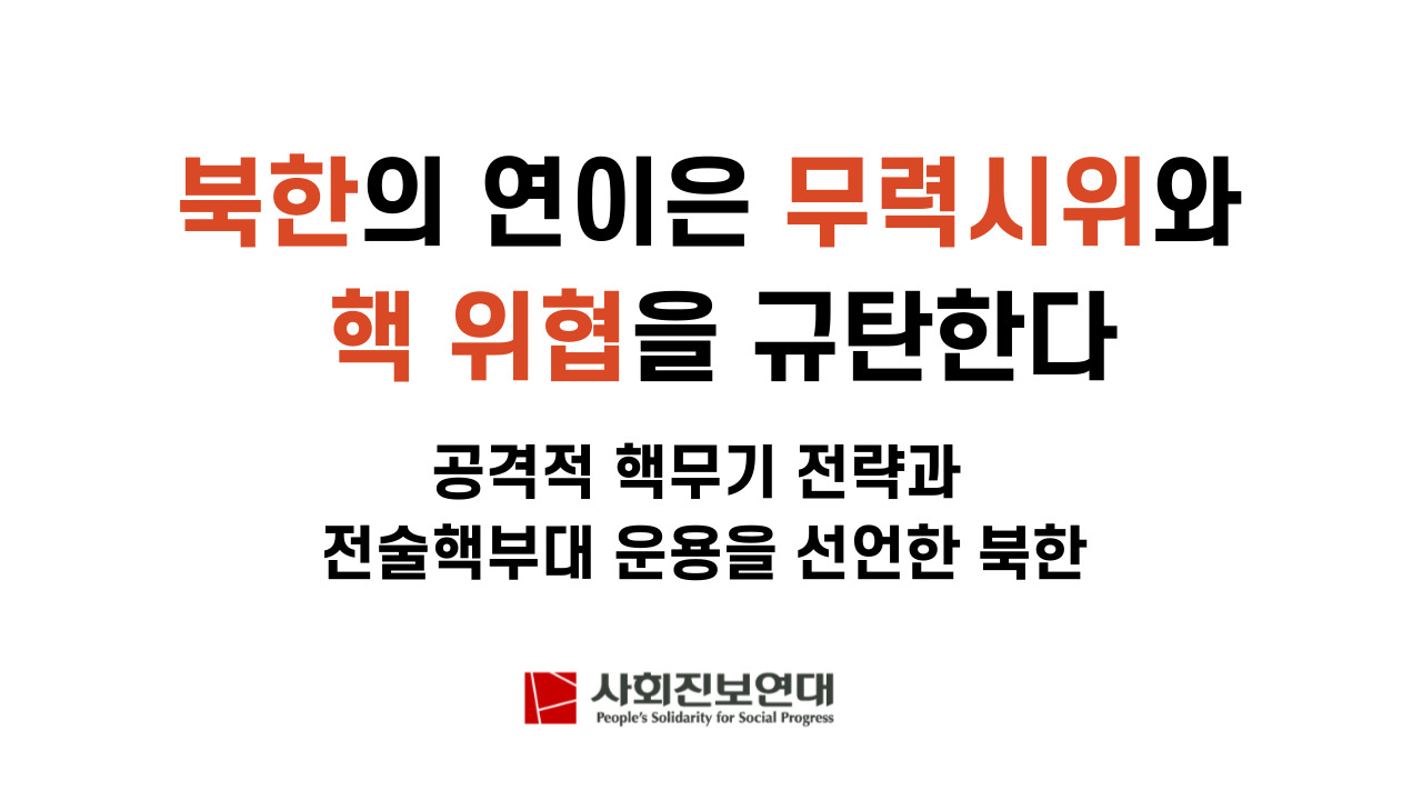 사회진보연대는 이러한 동향에 있어 근본적인 배경은 무엇보다도 “핵은 우리의 국위이고 국체이며 공화국의 절대적인 힘”(9월 8일 김정은 북한 국무위원장 연설)이라는 북한 당국의 인식이라고 파악한다. 북한 당국은 일가와 정권의 생존을 핵무기라는 반인도적 대량살상무기 확보와 동일시하고, 남한과 일본 민중을 위협하여 정권의 안위를 보장받고자 한다. 북한 핵 개발의 역사를 상세히 검토하면 북한의 핵 개발은 모두 미국 정부의 대북 강경책 때문이라고 설명할 수 없음을 알 수 있으며, 북한은 스스로 공언한 비핵화 약속을 거듭해서 어겼다. 단적으로, 북미 제네바 합의의 붕괴가 전적으로 미국 탓이라는 남한 사회운동 일반의 이해와 달리, 이미 북한 정부가 선제적으로 제네바합의를 무시하고 핵무기 개발을 지속하고 있었다는 사실이 2010년에 드러났다.