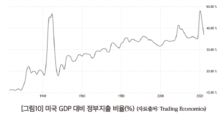 미국의 정부지출은 1907년 GDP 대비 6.55%에 불과했으나, 2022년에는 47.66%에 달했다. 사실 20세기 초반까지도 GDP의 10%를 과세할 수 있는 능력을 지닌 국가는 세계 어디에도 없었다.
