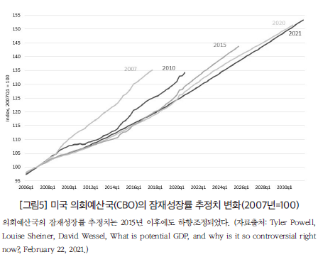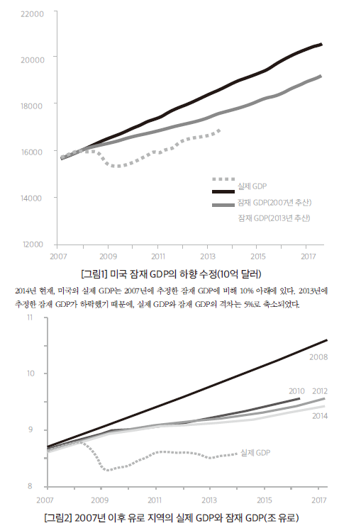 서머스가 장기침체를 우려하는 글을 발표하였을 때는 2014년으로, 미국 경제가 경기침체의 깊은 골에 빠졌던 2009년 초여름으로부터 5년이 흐른 시점이었다. 이 시기 미국 경제는 지속적으로 성장했고 고용도 증가했다. 그렇지만 실제 GDP와 잠재 GDP 간 격차가 얼마간 좁혀진 것은 경제성장이 가팔랐기 때문이 아니라, 잠재 GDP가 하락했기 때문이었다. (잠재 GDP는 물가를 자극하지 않으면서 생산요소를 완전히 고용하여 달성할 수 있는 최대 산출치를 뜻한다.)
