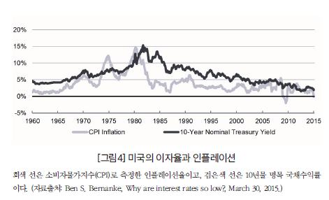 버냉키는 서머스와 다른 방식으로 이자율이 낮은 이유를 설명했다. 버냉키도 낮은 이자율이 단기적 일탈이 아니라 장기적 경향의 일부라는 점은 인정한다. 위 그림4처럼 미국의 10년물 정부 채권 수익률은 1960년대에 상대적으로 낮았다가, 1981년에 15%로 정점을 찍은 뒤 계속 하락했다. 이런 패턴은 부분적으로는 인플레이션율의 상승과 하락으로 설명할 수 있다. 즉 다른 모든 조건이 같다면 투자자는 인플레이션율이 높을 때 더 높은 수익률을 요구할 것이기 때문이다. 그러나 물가연동국채의 수익률도 매우 낮아서, 5년물 국채의 실질 수익률은 현재 약 마이너스 0.1%다.