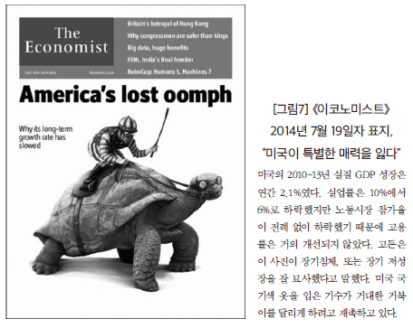 다른 선진국 경제를 보더라도 비슷한 의문이 나올 수밖에 없다. 2000년대 처음 10년간 유로 지역의 경제실적은 인상적이었지만, 이는 유로 지역 경제에 금융자본이 유입된 결과로, 지속불가능한 거품에 의존한 것이었다. 지난 2009~14년 유로 지역의 경제실적을 보면 미국보다 더 불만족스럽다. 일본은 20년간 가까스로 1% 수준의 성장률을 보였다.