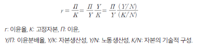 이윤분배율이 일정하다고 할 때, 노동생산성 상승 폭에 비해 자본의 기술적 구성(일인당 고정자본)이 증가 폭이 크면 이윤율이 하락한다. 달리 말해, 경제성장 과정에서 수익성 있는 기술진보의 어려움이 가중되면서, 일인당 고정자본의 증가 폭에 부합하게 노동생산성이 상승하지 못하면 이윤율이 하락한다.