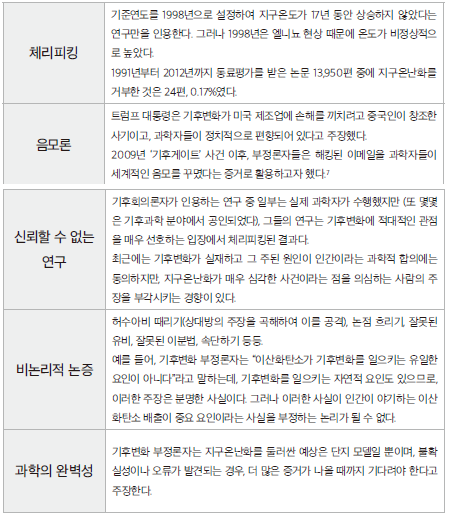 첫째, 체리피킹, 즉 자신에게 유리한 자료나 사례만 선택하고 불리한 것은 무시하는 방식으로, 증거를 수집한다. 둘째, 음모론을 믿는다. 셋째, 가짜 전문가나 신뢰할 수 없는 연구에 의존한다. 넷째, 논증이 비논리적이다. 다섯째, 과학이 완벽해야 한다고 주장하면서, 과학이 달성할 수 있는 범위를 뛰어넘는 불가능한 목표를 설정한다. 기후변화 사례를 들어 설명해보면 이런 표로 정리할 수 있다.