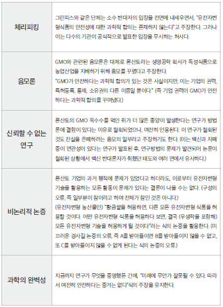 물론 그 과정에서 GMO 반대 운동이 매우 중요한 역할을 했을 것이다. 매킨타이어는 자신이 정리한 과학부정론의 전형적인 논법이 GMO 반대론에서 정확히 동원된다고 설명한다.