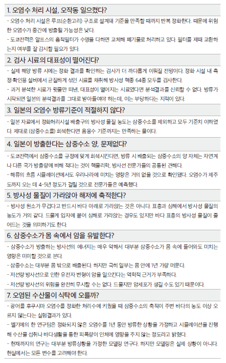 아래의 표는 《동아사이언스》에 2023년 7월 9일부터 7월 15일까지 일곱 차례 연재된 기사를 필자가 정리한 것이다. 이 중에서도 “도쿄전력에서 삼중수소를 규정에 맞게 희석한다면, 방류 시 배출되는 삼중수소의 양 자체는 자연계나 다른 국가 방출량에 비해 적다는 것이 핵물리학, 방사선 전문가들의 공통된 견해다” “해류의 흐름 시뮬레이션에서도 우리나라에 미치는 영향은 거의 없을 것으로 확인됐다. 오염수가 제주도까지 오는 데 4~5년 정도가 걸릴 것으로 전문가들은 예측했다”는 팩트체크가 가장 핵심일 것이다.