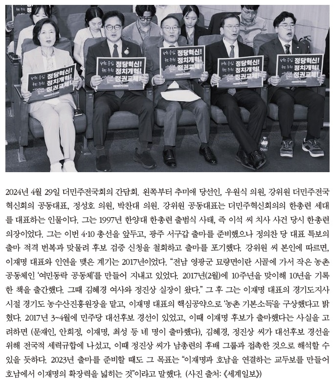 당연히 강성 당원들이 격렬한 의사표시에 나섰는데, 당원 게시판에는 “민주당 안에 잔존 수박(비이재명계)이 많다는 증거”라거나, “탈당하고 조국혁신당에 입당하겠다”며 탈당 신청서를 인증하는 게시글도 올라왔다. 이재명 대표 온라인 팬카페인 ‘재명이네마을’에 올라온 글도 우원식 의원이 활동하는 민주평화국민연대(민평련) 등을 겨냥해 “민평련과 친문, 586 등 계파 문제가 많다. 이들을 색출해야 한다”고 했다. 이 글은 민평련-친문-586, 즉 1970~80년대 학번 이후 세대, 즉 1990년대 한총련 세대가 이재명 대표 강성 지지층의 주축을 이루고 있는 것이 아니냐는 추측을 가능케 한다. (이 문제는 뒤에서 ‘더민주혁신회의’를 다루며 다시 언급한다.)