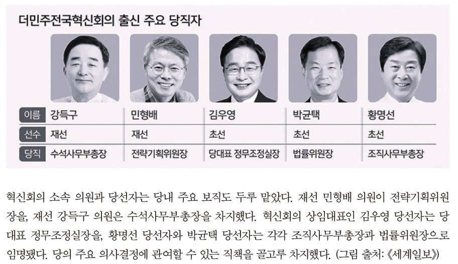 한편, 이러한 흐름의 중핵에는 더민주전국혁신회의(혁신회의)가 자리 잡고 있다. 혁신회의는 2023년 6월 공식 출범한 조직으로 당시에는 친명계 원외조직이었으나, 이번 4·10 총선에서 상당히 많은 수의 소속 인사가 현역 의원을 꺾고 공천을 받아 원내에 입성했다. 총 50명이 출마해 31명이 당선되어, 당내 최대계파로 급부상했다는 평가도 나온다.