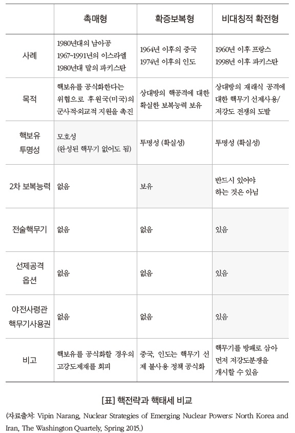 미국, 소련의 핵전략·태세는 대체로 대량보복, 신축반응, 상호확증파괴, 피해제한 등으로 알려졌는데, 핵무기 선제사용 능력과 충분한 보복능력을 포함했다. 그러나 다른 국가들은 핵능력, 관리절차, 투명성 수준에서 미국·소련과 상당히 다르다. 미국의 정치학자 비핀 나랑은 이들의 핵전략·태세를 대략 ① 촉매형, ② 확증보복형, ③ 비대칭적 확전형으로 구분했다.