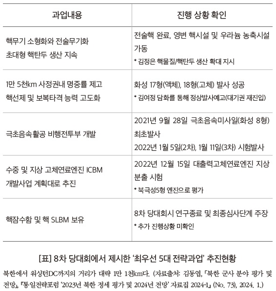 이때 김정은 북한 국무위원장은 ‘핵무기 고도화’를 선언했다. 핵무기 소형화와 전술무기화, 초대형 핵탄두, 1만 5천 km급 대륙간탄도미사일(ICBM), 극초음속활공비행체(HGV), 다탄두개별유도기술(MIRV), 중형잠수함 및 핵잠수함(SSN), 수중·지상 발사 고체형 ICBM, 수중 발사 핵전략무기(SLBM 또는 SLCM), 중장거리 순항미사일, 군사정찰위성 등 연구·개발 중인 무기까지 이례적으로 소개했다.