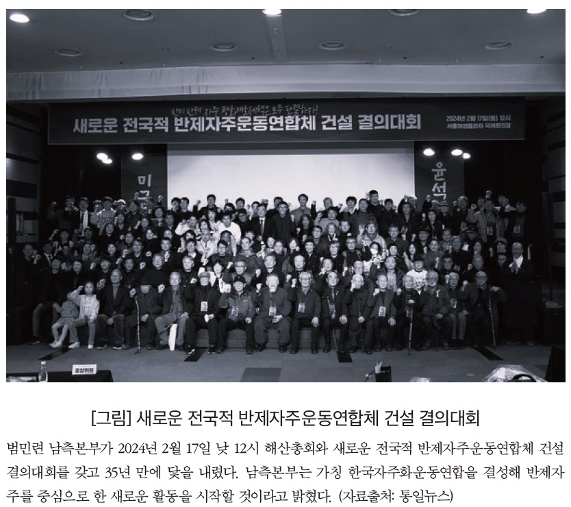 북한의 돌연한 입장 발표 후, 북한 쪽의 통일운동 기구, 즉 조국통일범민족연합(범민련) 북측본부와 6·15공동선언실천 북측위원회도 해산을 결정했다. 이러한 북한 측 조치에 조응하여 2024년 2월 17일 범민련 남측본부도 해산과 함께, ‘새로운 전국적 반제자주운동연합체’(가칭 한국자주화운동연합)를 결성하겠다는 입장을 밝혔다. 또한 3월 15일, 6·15공동선언실천 해외측위원회도 해산을 발표했는데, 이들도 앞으로 “해외 각 지역, 단체마다 특성을 살려 반미, 반일, 반윤석열 투쟁을 과감히 전개해나가겠다”고 말했다.