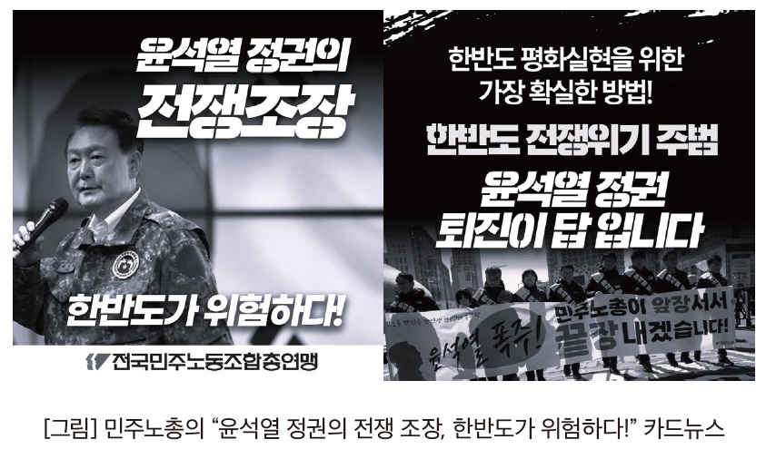 또 한편 최근 민주노총은 “윤석열 정권의 전쟁 조장, 한반도가 위험하다!”라는 제목의 카드뉴스를 발간했다. 3월 4~14일 진행되는 한미연합군사연습 ‘자유의 방패’에 대응하기 위한 것이었다.