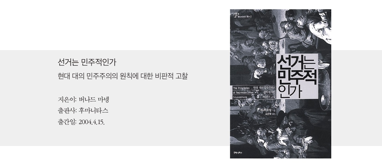 그런 점에서, 버나드 마넹의 <선거는 민주적인가> (1995년, 원제는 The Principles of Representative Government)는 고대 아테네에서부터 현재까지 민주정과 대의제의 여러 형태를 꼼꼼히 검토하고 비교하고 있다는 점에서 눈에 띈다. 원제를 직역하면 ‘대의 정부의 원칙들’인데, 마넹은 ▲ 주기적·반복적 선거 ▲ 대표의 부분적 독립성 ▲ 여론의 자유 ▲ 토론을 통한 심판·결정이라는 네 가지의 원칙 역시 도출한다. 그는 이 원칙들에 의해 결론적으로 선거가 “민주정·귀족정의 성격을 양면적으로 가진 혼합 정체(政體)”를 구성한다고 주장한다.
