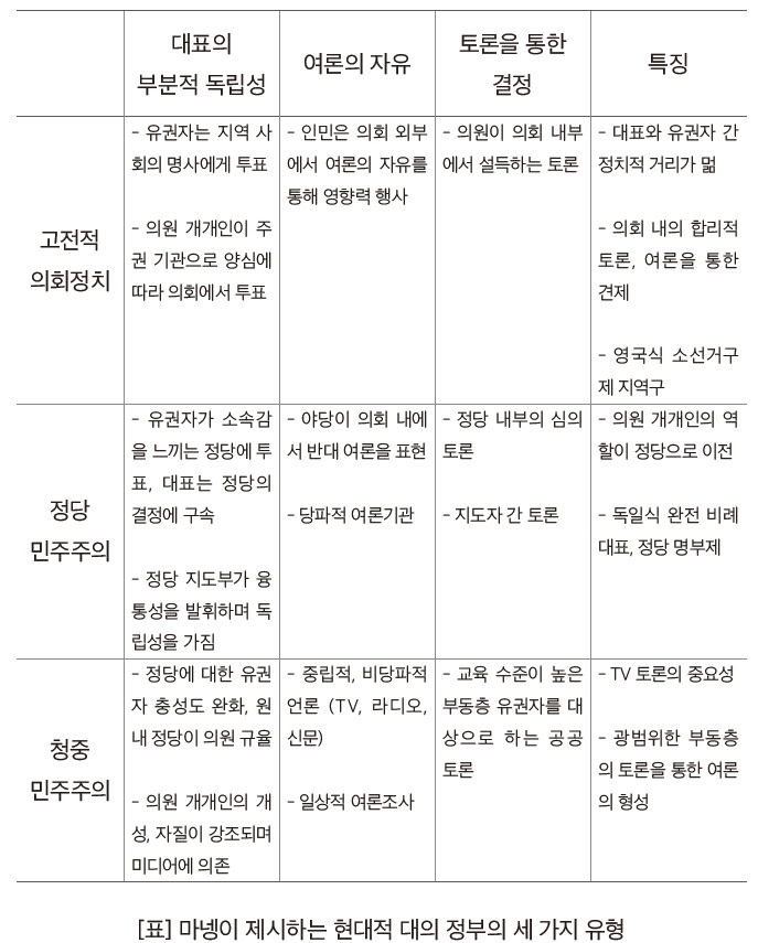 그러나 되돌릴 수 없을 정도로 확고해 보였던 정당 민주주의는 1970년대 이후 그 결정적 특징이었던 ‘유권자와 특정 정당·의회 대표 사이의 동일시’, ‘정강에 대한 선택’이 퇴색하면서 빠르게 힘을 잃었다. 마넹은 이후 현대적 대의 정부의 몇 가지 특징을 근거로 ‘청중 민주주의’라는 새로운 유형에 대한 도식화를 시도한다. 따라서 아래에서는 ‘의회정치’, ‘정당 민주주의’, ‘청중 민주주의’ 세 유형을 마넹이 제시한 대의제의 원칙에 따라 비교한다. 각 유형의 특징을 비교해보는 것은 구체적으로 ‘어떤’ 민주주의가 위기에 빠진 것인지, 그렇다면 대안은 무엇인지를 가늠하는데 좋은 지표가 될 수 있을 것이다.