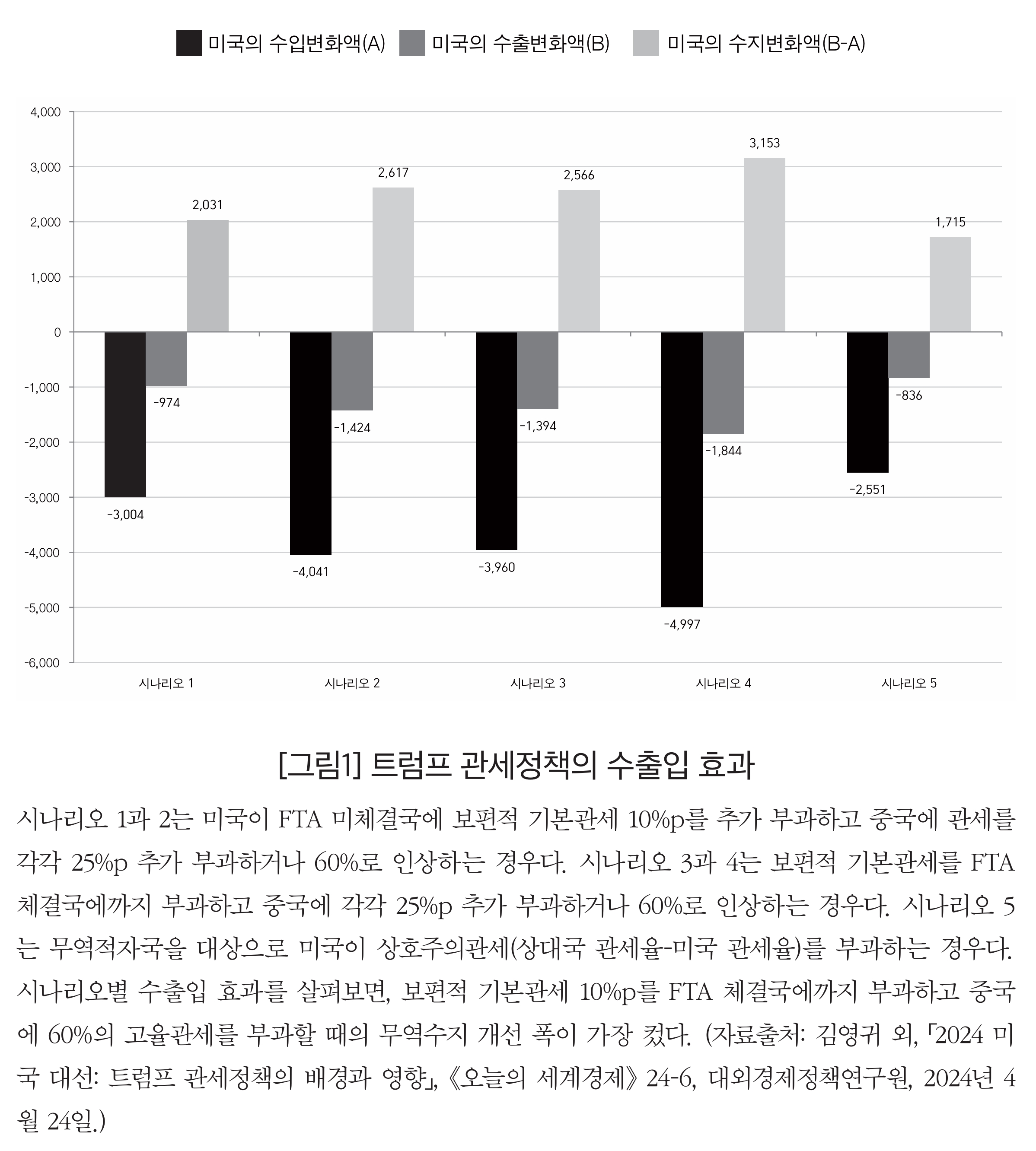 그렇다면 트럼프가 제안한 보편적 기본관세와 상호주의관세가 실제로 시행될 경우 나타날 교역효과를 전망한 분석을 [그림1]을 통해 살펴보자. 대외경제정책연구원에 따르면, 보편적 기본관세·상호주의관세·중국에 대한 고율의 관세를 시행하는 각 시나리오에서, 미국의 수입액은 약 2551억 달러에서 최대 4997억 달러 감소하고, 수출액은 약 836억 달러에서 최대 1844억 달러 감소할 것으로 나타났다. 따라서 무역수지는 약 1715억 달러에서 최대 3153억 달러 개선될 것으로 나타났다. (2023년 기준 미국의 전체 무역수지 적자 규모는 7734억 달러다)