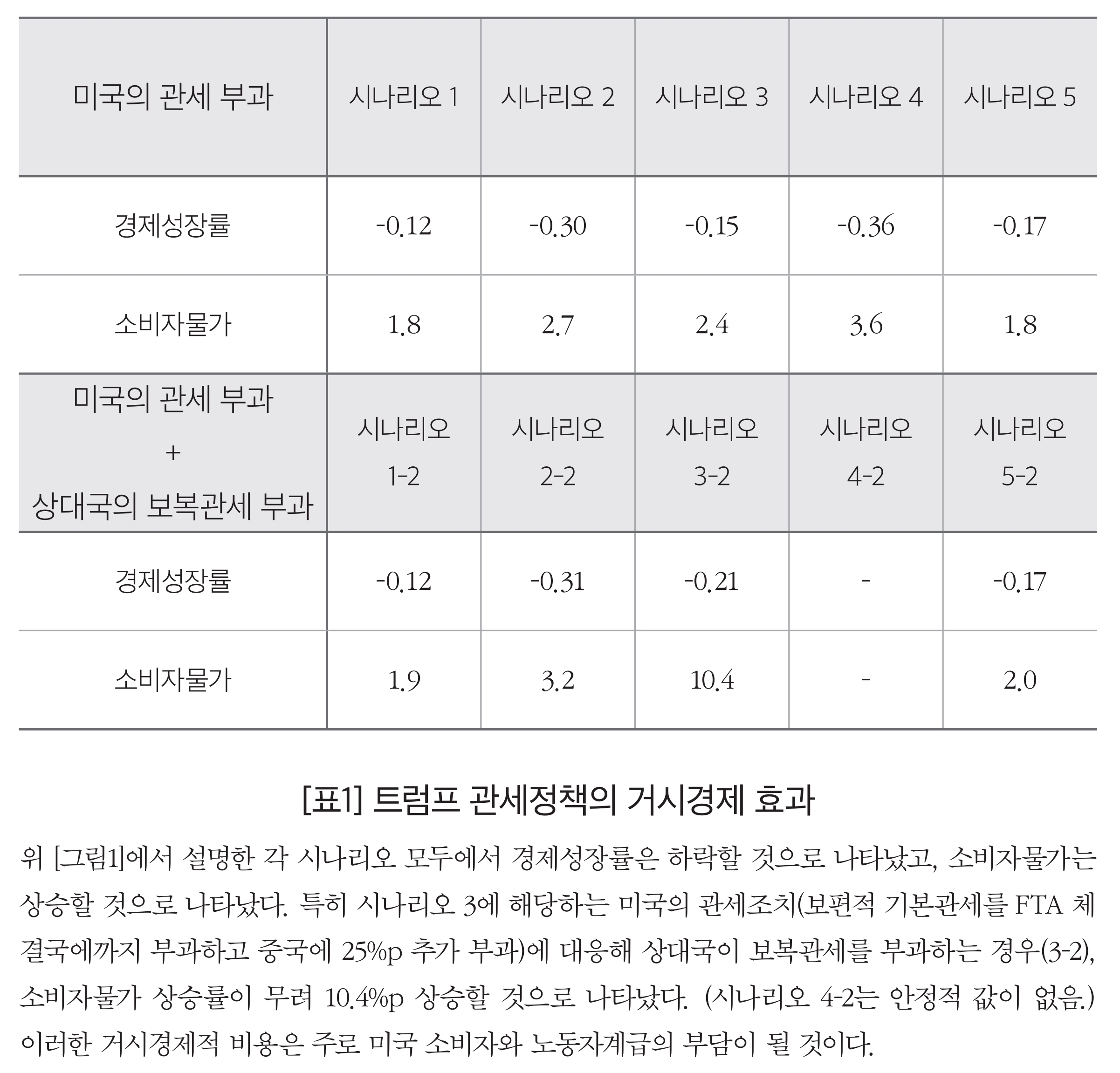 이렇게 볼 때, 트럼프의 대규모 관세 조치는 미국의 수입을 상대적으로 더 많이 감소시켜 무역적자를 어느 정도 줄이는 것 자체는 가능할 것처럼 보인다. 그러나 미국은 그 대가로 경제성장 저하와 물가 상승이라는 막대한 거시경제적 비용을 치러야 할 것이다. 같은 분석에서, 보편적 기본관세를 시행할 경우 미국의 실질 GDP 성장률이 약 0.12%p에서 최대 0.36%p 감소하고, 상호주의관세를 시행할 경우 약 0.17%p 감소하는 것으로 나타났다. 무엇보다, 보편적 기본관세와 상호주의관세는 미국의 소비자물가를 1.8%p~3.6%p 상승시킬 것으로 나타났다. 특히 상대국이 미국에 보복관세를 부과할 경우에는 물가상승 압력이 더욱 커질 것으로 나타났다.
