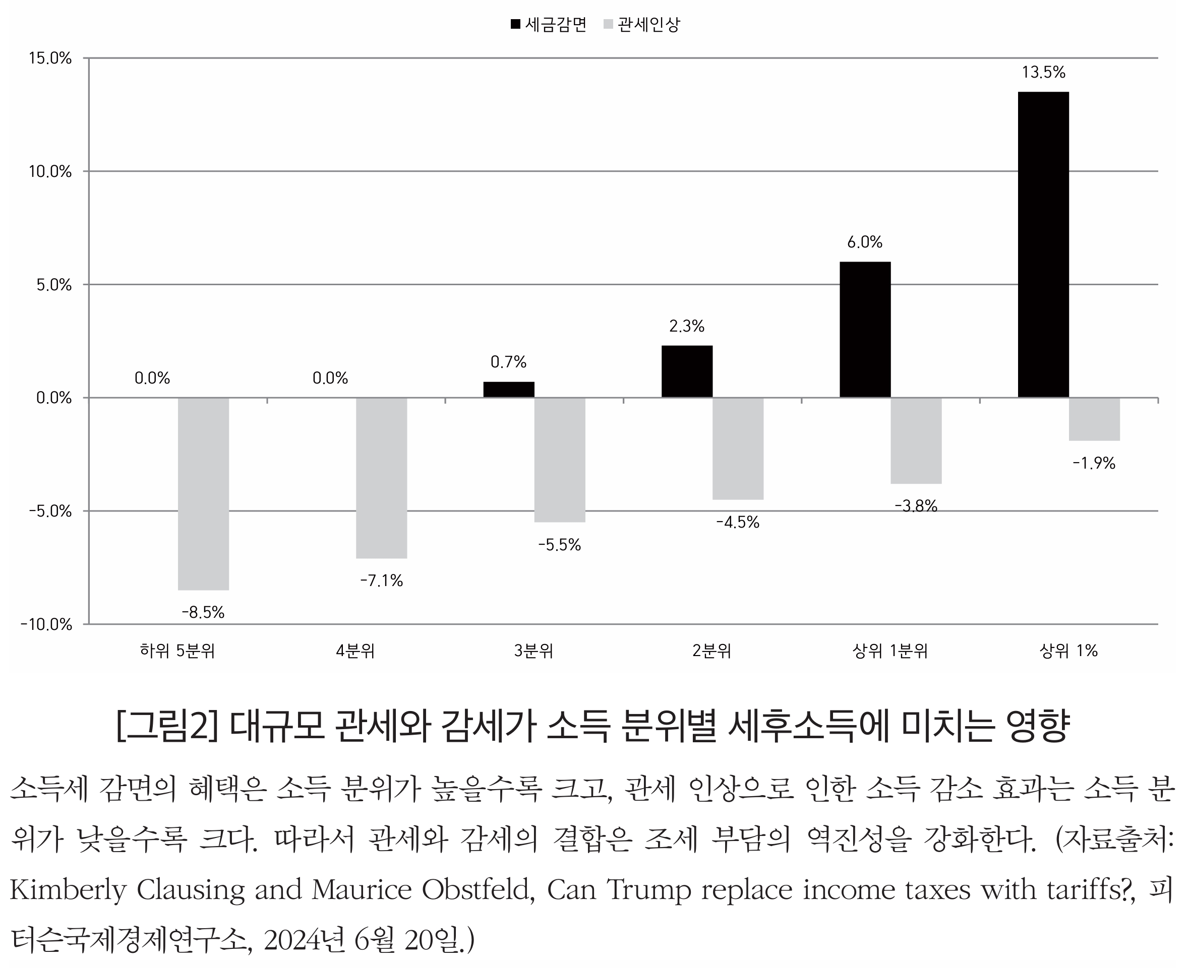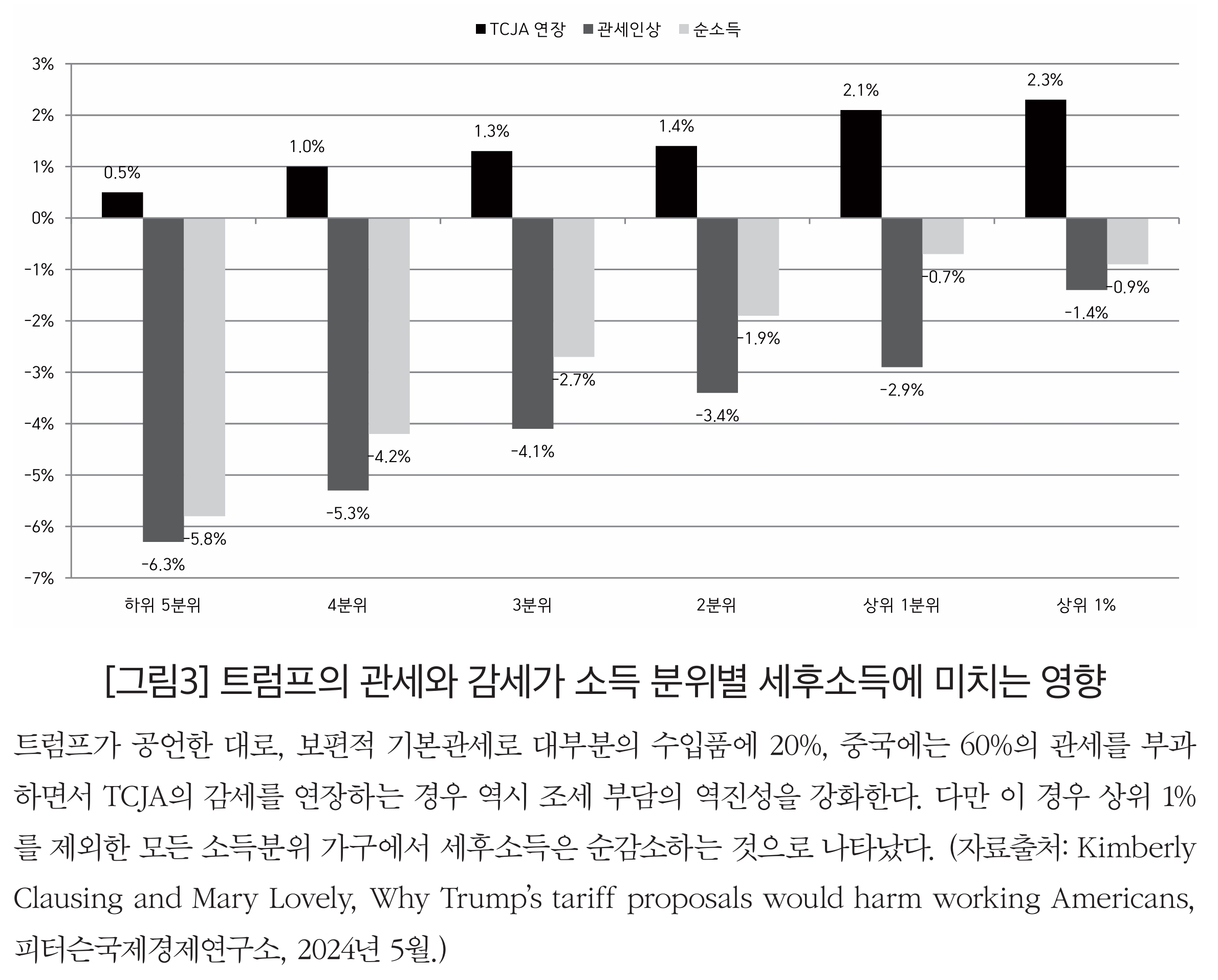 한편, 이보다 좀 더 현실성 있는 가정, 즉 대부분의 수입품에 20%의 관세를 부과하고 중국에 60%의 관세를 부과하면서 TCJA의 감세를 연장하는 경우에는 소득 분위별로 세후소득이 얼마나 증감하는지도 살펴볼 수 있다. [그림3]에 따르면, 모든 소득 분위 가구에서 세후소득이 역진적으로 순감소하는 가운데, 상위 1%의 세후소득만이 0.9% 순증가한다. 전형적인 미국 가구라고 할 수 있는 중간 분위의 세후소득은 2.7% 순감소하는데, 이는 중간 분위 가구가 트럼프가 시행할 관세정책으로 인해 연간 2600달러의 비용을 더 지출하게 된다는 것을 의미한다.